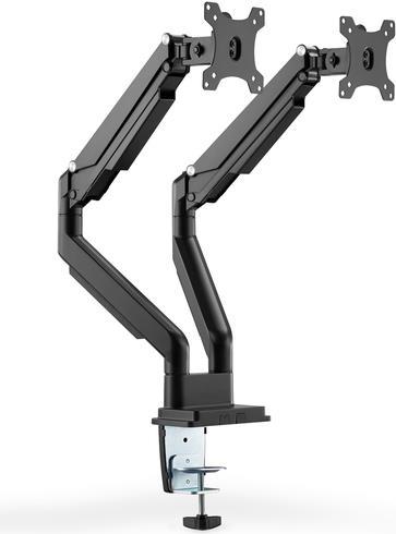 Mit der universellen Dual-Monitorhalterung von DIGITUS® können Sie zwei Monitore der Größen 15" - 32" bequem per Klemmhalterung am Schreibtisch befestigen. Die Quick-Release-Funktion erleichtert Ihnen zudem die Installation der Monitore. Die VESA-Halterung wird ganz einfach in die entsprechende Aufnahme geschoben und rastet automatisch ein. Ohne großen Aufwand richten Sie die Monitore nach Ihren Bedürfnissen aus und können diese schwenken, neigen oder den Monitor selbst drehen z. B. für Hochformat-Monitore. Die Unterstützung der integrierten Gasdruckfeder erleichtert Ihnen die Höhenverstellung Ihrer Monitore. Tun Sie sich und Ihrer Gesundheit etwas Gutes, indem Sie den Monitor optimal an Ihren Körper und Ihre Sitzposition anpassen. Zusätzlich lassen sich die Kabel der Monitore ordentlich durch die mitgelieferten Kabelführungen verlegen.
