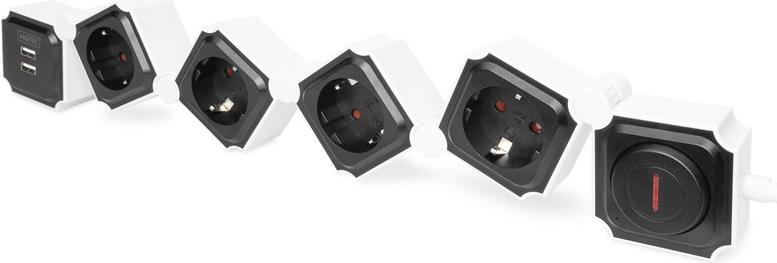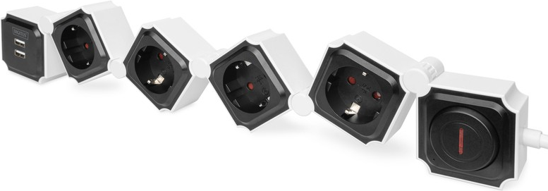 Mit der flexiblen Steckdosenleiste von DIGITUS können Sie die einzelnen Steckdosen nach Belieben ausrichten und an Ihre Umgebung sowie die verschiedenen Steckertypen anpassen. Jedes Gerät hat unterschiedlich große Stecker oder Netzteile, was bei herkömmlichen Steckdosenleisten oft zu Platzproblemen führen kann. Die Elemente dieser flexiblen Steckdosenleiste lassen sich um bis zu 180° verstellen und geben Ihren ausladenden Netzteilen oder sperrigen Winkelsteckern den Raum, den Sie benötigen. Ebenso kann die Steckdosenleiste um Ecken oder Kanten des Arbeitsplatzes herum gelegt werden und lässt sich dadurch optimal Ihrer Umgebung anpassen. Zusätzlich sind zwei USB-Ports integriert, mit dem sich Smartphones oder Tablets mit USB A Stecker aufladen lassen. Der Ein- / Ausschalter kann auch als Fußschalter genutzt werden, beispielsweise beim Einsatz unter dem Schreibtisch. Die Steckdosenleiste lässt sich in alle erdenklichen Formen ausrichten und ermöglicht Ihnen so maximale Flexibilität.