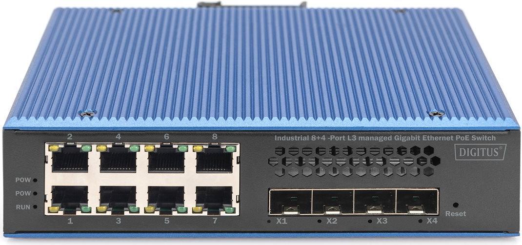 Digitus Industrial 8 + 4 10G Uplink Port L3 managed Gigabit Ethernet PoE Switch. Switch-Typ: Managed, Switch-Ebene: L2/L3. Basic Switching RJ-45 Ethernet Ports-Typ: Gigabit Ethernet (10/100/1000), Anzahl der basisschaltenden RJ-45 Ethernet Ports: 8, Anzahl installierte SFP Module: 4. Vollduplex. MAC-Adressentabelle: 32000 Eintragungen, Routing-/Switching-Kapazität: 1 Gbit/s. Netzstandard: IEEE 802.3af. DC input Spannung: 12 - 48 V. Power over Ethernet (PoE) (DN-651161)