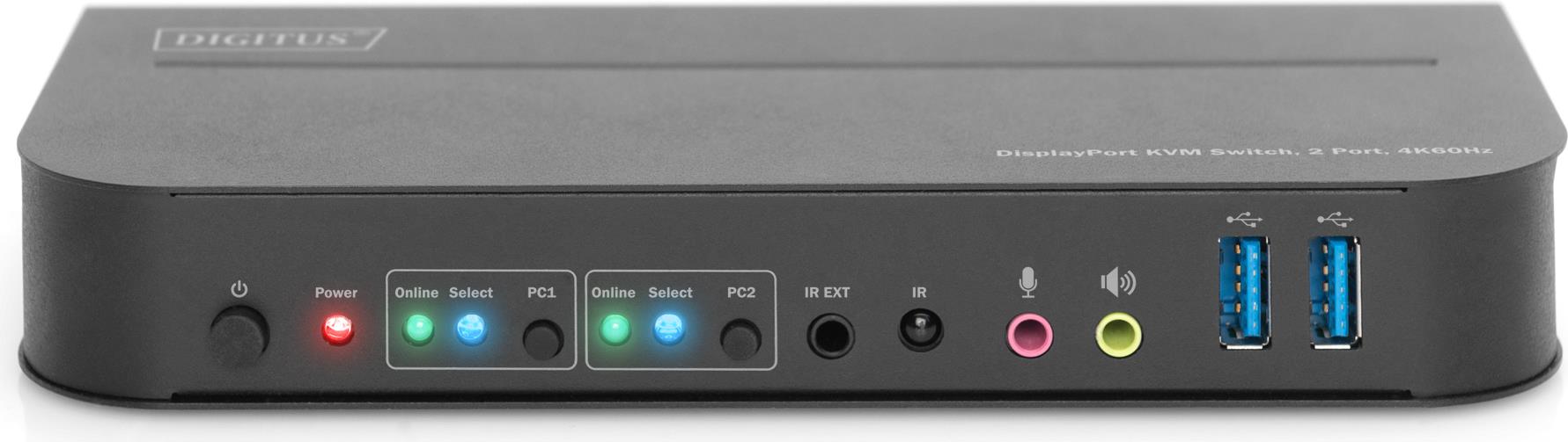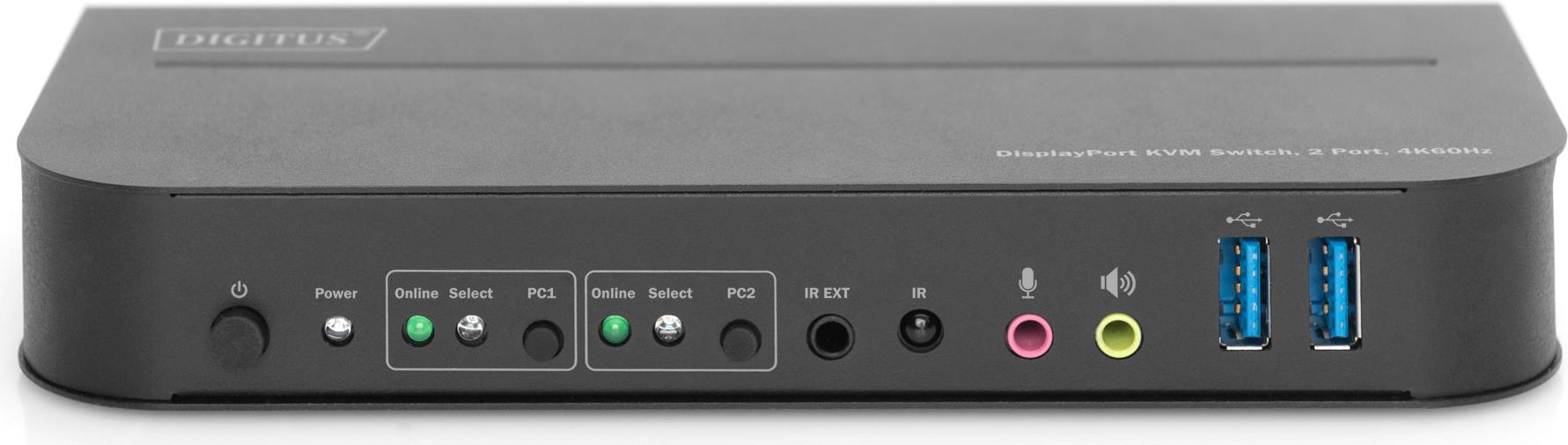 Mit dem DIGITUS® 2-Port KVM-Switch haben Sie die Möglichkeit, zwei 4K-fähige PCs über eine einzige USB-Tastatur und -Maus zu bedienen. Per Knopfdruck oder mitgelieferter Fernbedienung schalten Sie bequem zwischen den beiden PCs um und sparen sich aufwendiges Umstecken sämtlicher Kabel. Die Ausgabe an einen Monitor erfolgt wahlweise über den integrierten HDMI® oder DisplayPort Ausgang. Audiosignale von Mikrofon und Lautsprecher können ebenfalls umgeschaltet werden. Zusätzlich sind zwei USB 3.0 Anschlüsse an der Frontseite vorhanden, die für weitere Peripheriegeräte wie z. B. USB-Sticks oder externe Festplatten an beiden PCs genutzt werden können. Falls Sie den KVM-Switch an einer unzugänglichen Stelle aufstellen, können Sie den mitgelieferten IR-Empfänger inkl. Anschlusskabel nutzen, ohne dass sich der KVM-Switch selbst in Reichtweite der Fernbedienung befinden muss. Status LED an der Frontseite des Switches zeigen Ihnen jederzeit die aktuelle Konfiguration an. Abgerundet wird der schlanke Switch durch das robuste Metallgehäuse und die Möglichkeit der Wandbefestigung.