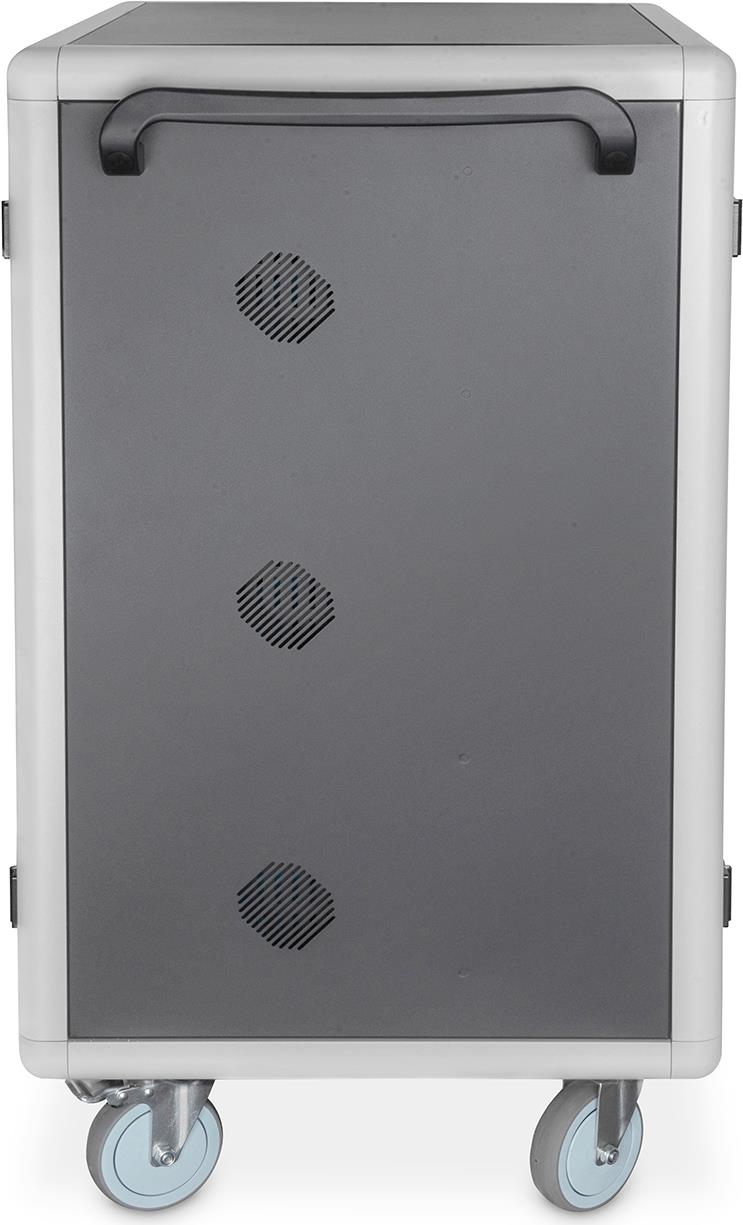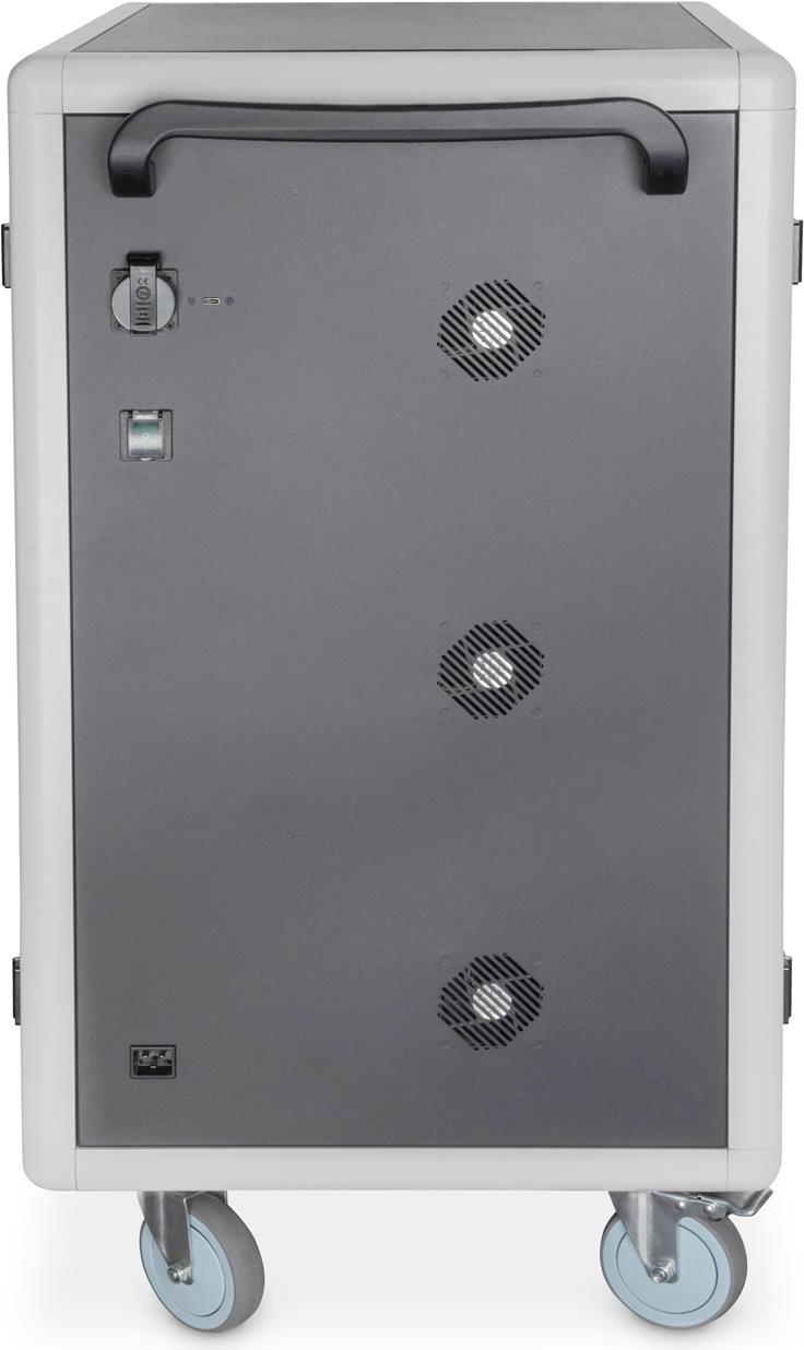 Der mobile Ladeschrank von DIGITUS® ist die ideale und kompakte Lösung zur Aufbewahrung und zum Aufladen Ihrer portablen Geräte, wie z. B. Notebooks und Tablets. Häufig werden mobile Ladeschränke in öffentlichen Einrichtungen wie z. B. Schulen genutzt, um die Geräte an einem zentralen Ort gesichert aufzubewahren und gleichzeitig laden zu können. Der Schrank beinhaltet 3 Reihen mit jeweils 10 Ladeplätzen, von dem jeder über einen eigenen USB-Anschluss an der Vorderseite verfügt. Zusätzlich können die Geräte rückseitig mit verbauten Steckdosenleisten (3 x 10-fach Schutzkontakt) verbunden werden. Dank der großzügigen Kabeldurchführungen und Überlängenablagen ist ein optimales Kabelmanagement garantiert. Verbaute Lüfter (3 x 24 V) in Verbindung mit Lüftungsschlitzen sorgen für eine aktive Entwärmung des Schrankes.
