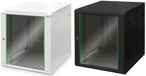 Die Netzwerkschränke zur Wandmontage der Dynamic Serie wurden für einen einfachen und besonders kostenoptimierten Netzwerkausbau entwickelt. Dach, Boden und Rückwand eines jeden Schrankes sind mit einem vorgestanzten Kabeleinlass ausgestattet. Für die Aufnahme eines Lüftermoduls wird das Dachchassis ebenfalls mit einem ausgestanzten Bereich versehen. Zwei Paar galvanisierte, mit in beide Richtungen ablesbare Höheneinheiten beschriftete 483 mm (19")-Profilschienen sind im Inneren verbaut. Diese lassen sich in der Tiefe verstellen. Jeder Schrank ist eine robuste Stahlkonstruktion aus bis zu 1,5 mm starkem Stahlblech. Die Farbgebung erfolgt in Form von elektrostatischer Pulverbeschichtung in den Standardfarben Grau (RAL 7035) und Schwarz (RAL 9005). Abnehmbare Seitenwände sowie die abschließ- und abnehmbare Fronttür, verbessern die Zugänglichkeit. Ein Türanschlagswechsel kann vorgenommen werden. Die Wandmontage erfolgt in zwei einfachen Arbeitsschritten: Das mitgelieferte Montageblech wird an die Wand geschraubt und im Anschluss mit dem Gehäuse verbunden.
