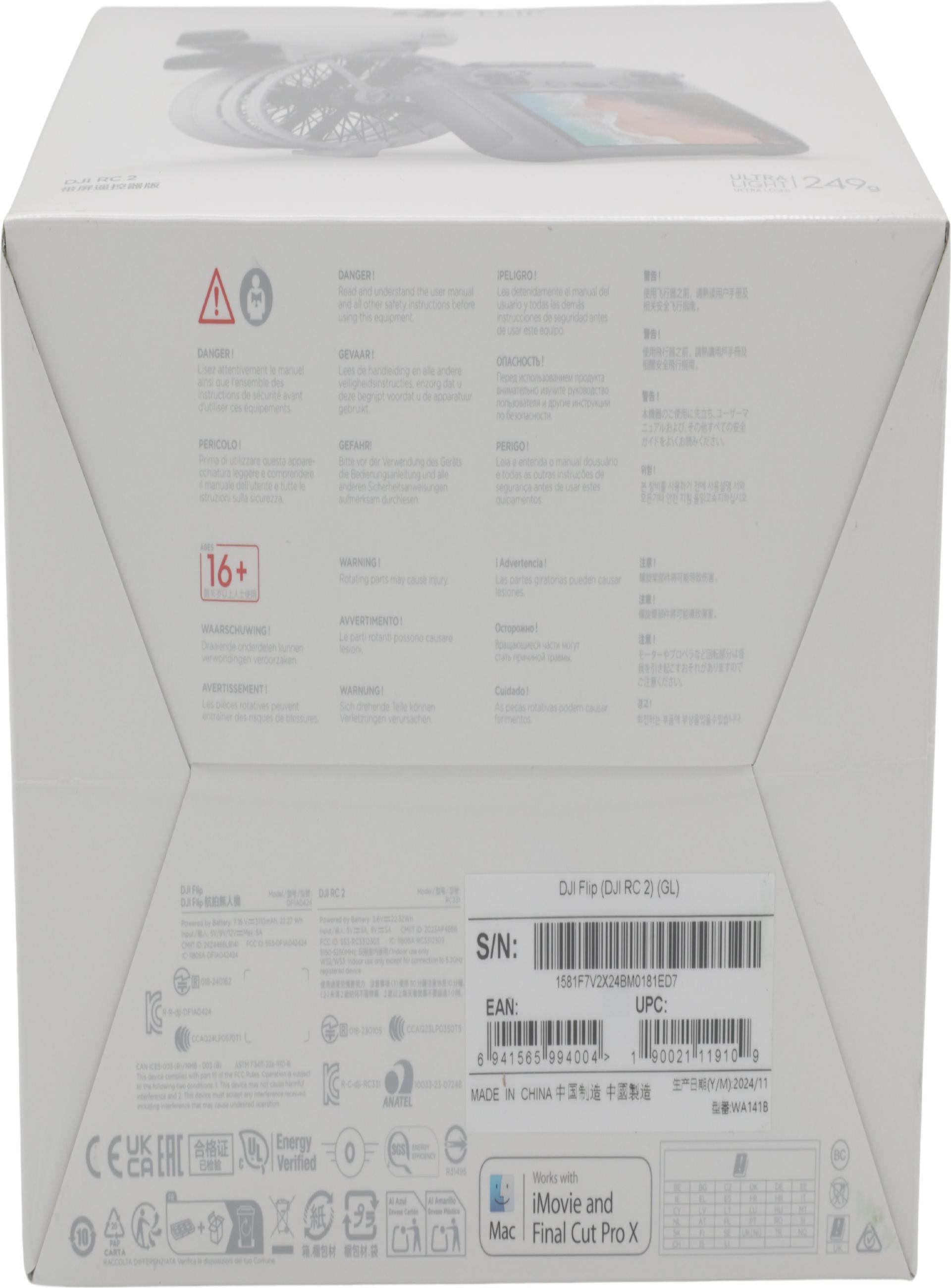 | Inhalt | 1x DJI Flip Drohne, 1x DJI RC 2 Fernsteuerung, 1x Intelligent Flight Battery, 1x Ersatzpropeller (Paar), 1x Gimbalschutz, 1x USB-C auf USB-C Kabel, Dokumentation |
