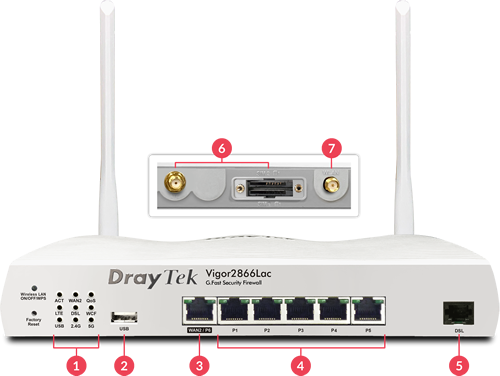 | LED-Anzeigen | Aktivität, DSL, LTE, USB, WAN |