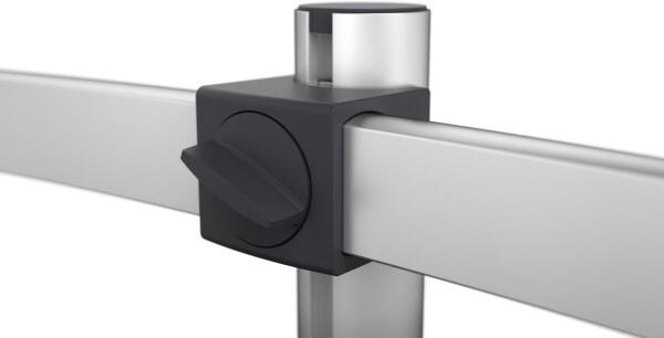 - Monitorhalterung besteht aus Tischsäule, Querstrebe und 2 verschiebbaren, drehbaren VESA-Befestigungen für Monitore