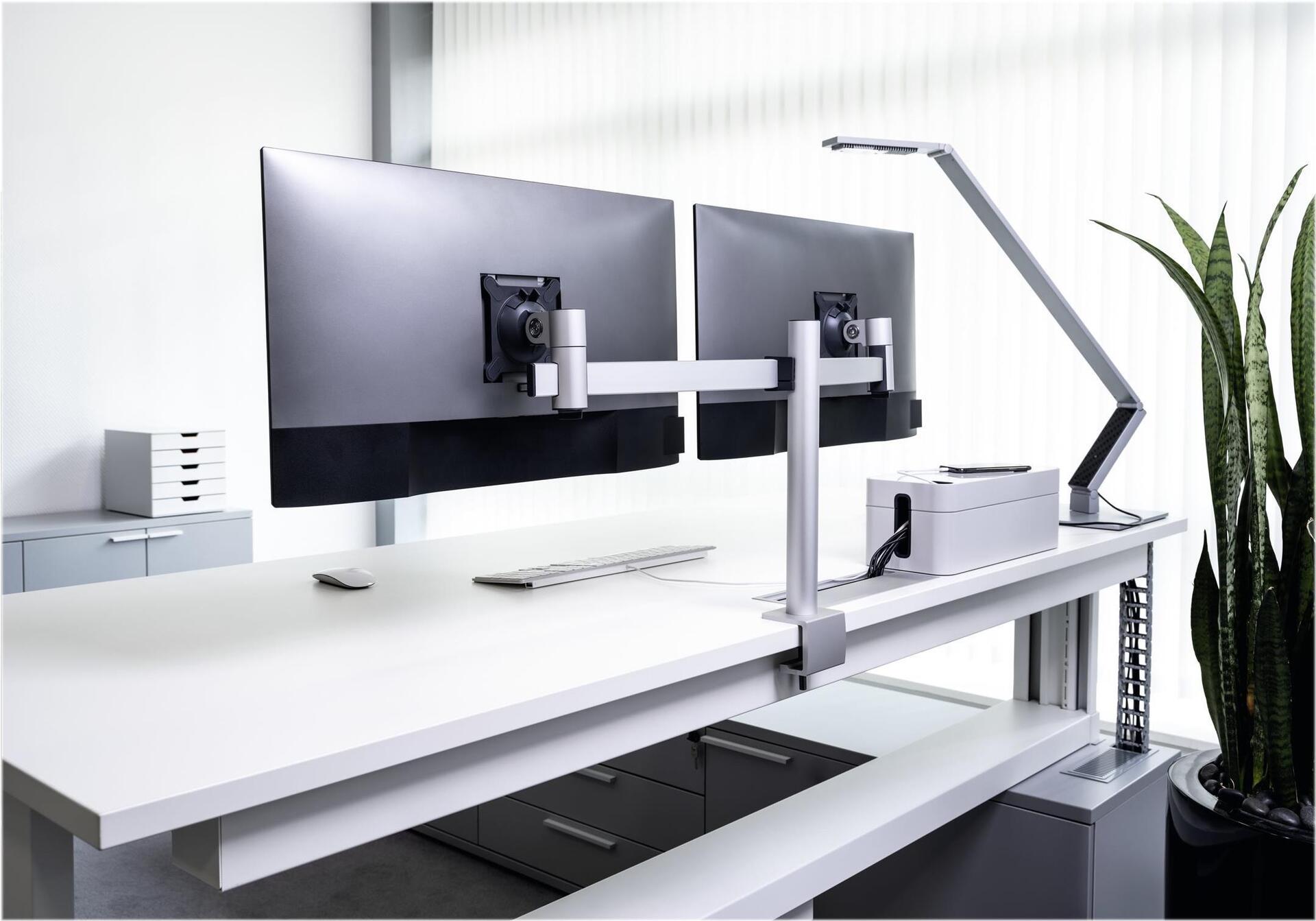 Ob beruflich oder privat, die meisten Menschen verbringen viel Zeit vor dem Computer Bildschirm. Gesundheit und Wohlbefinden spielen daher am Schreibtisch eine wichtige Rolle. Die Monitor Doppelhalterung von DURABLE unterstützt dabei besonders effizientes Arbeiten am ergonomischen Arbeitsplatz.