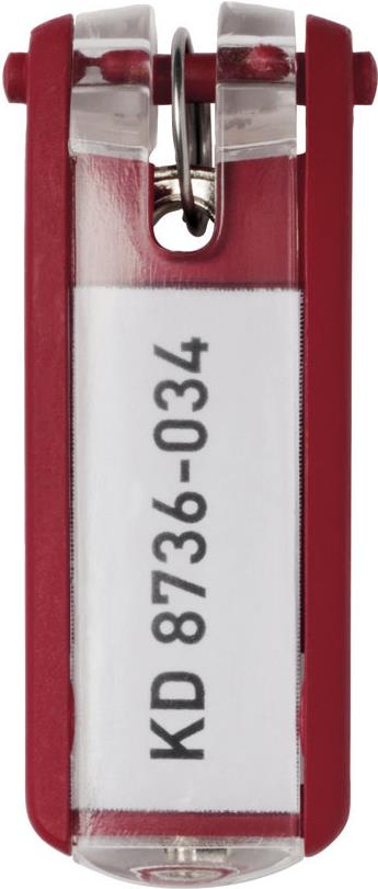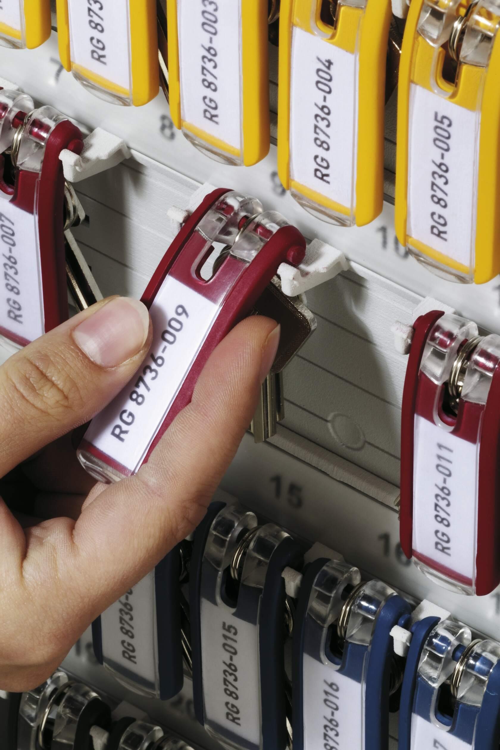 Schlüsselanhänger in unterschiedlichen Farben als Ordnungskriterium. Flaches Anliegen der Anhänger durch Formgebung und Technik der Clips. Durch "Klick"-Mechanik ist der Anhänger leicht zu beschriften.