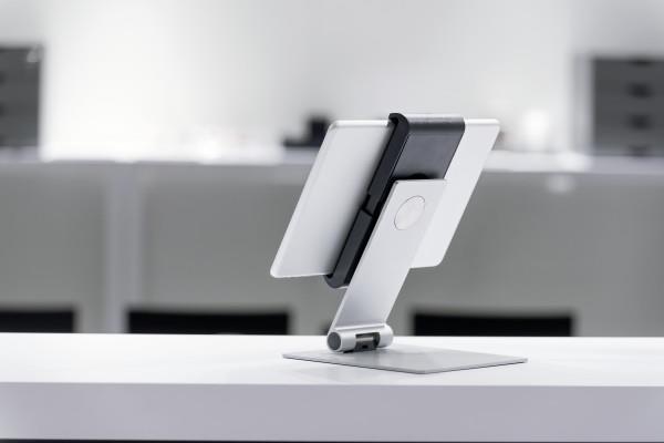 Die hochwertige Tablet-Tischhalterung eignet sich für die professionelle Anwendung von Tablets in Büros, öffentlichen Gebäuden sowie in Verkaufs- und Ausstellungsräumen. Mit seinen edlen Oberflächen und einer hohen Standfestigkeit lässt sich der Tablet-Tischständer auch ideal für Präsentationszwecke einsetzen.
