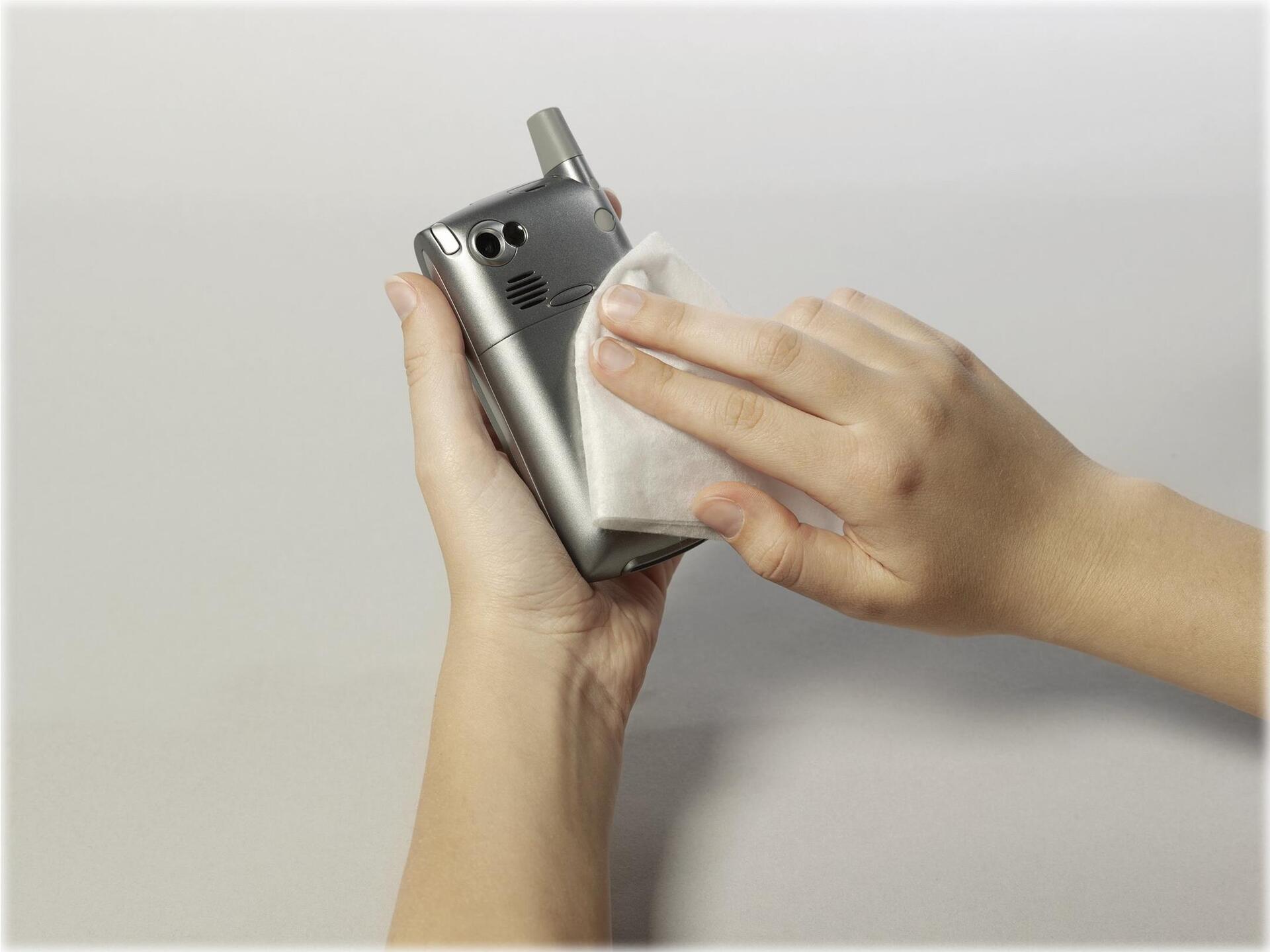 50 einzeln verpackte, fusselfreie Vliestücher, getränkt in alkoholfreie Flüssigkeit zur schonenden und hygienischen Reinigung von Handys und Telefonen.