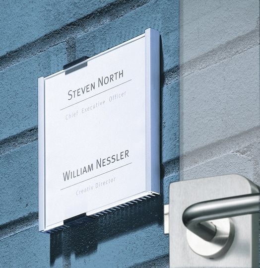 Hochwertige Türbeschilderung aus Aluminium. Nicht spiegelndes Acrylglas ermöglicht optimale Lesbarkeit der Beschriftung. Kostenloses Download zur Beschriftung mit verschiedenen Musterschildern.
