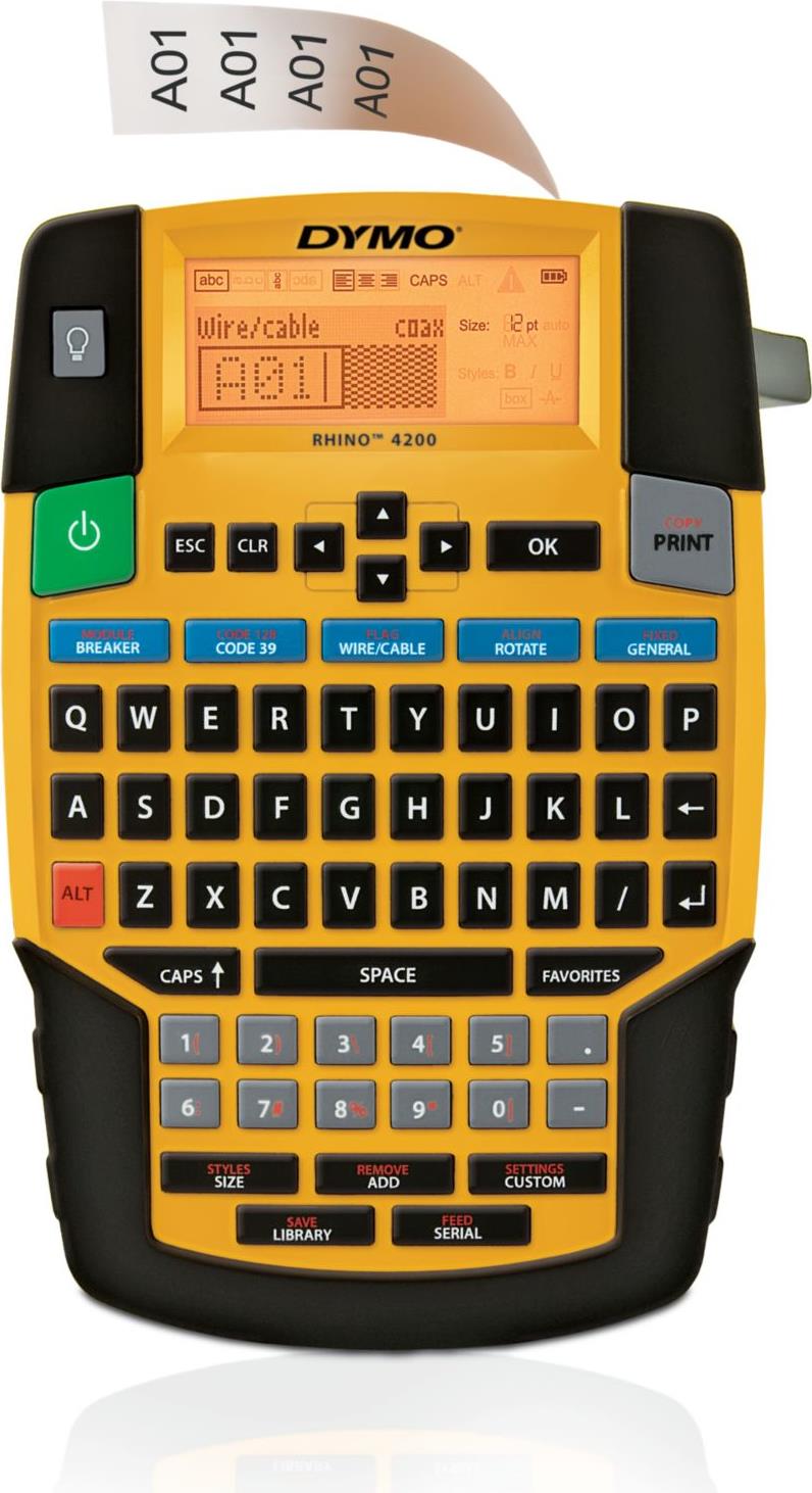 Der DYMO Rhino 4200 erledigt Etikettierarbeiten schnell und ordentlich. Die gewohnte QWERTZ-Tastatur ermöglicht eine leichte Handhabung. Mit den Direktzugriffstasten können Sie auf schnelle Art Kabel-/Drahtbeschriftungen, Fähnchenetiketten, die Barcodes Code 39 und Code 128, Etiketten mit fester Länge oder für Module und vieles mehr erstellen und formatieren. Drucken Sie bis zu 19 mm breite Etiketten aus flexiblem Nylon, permanentem Polyester oder strapazierfähigem Vinyl - UND drucken Sie direkt auf Schrumpfschläuche. Sparen Sie sogar noch mehr Zeit mit großartigen Funktionen, wie der Favoritentaste, die Ihnen über nur eine Taste den Zugriff auf häufig verwendete Etiketten, Symbole und Begriffe ermöglicht, und der benutzerspezifischen Taste, mit der durch Speicherung der benutzerspezifischen Einstellungen unnötige Vorgänge vermieden werden.