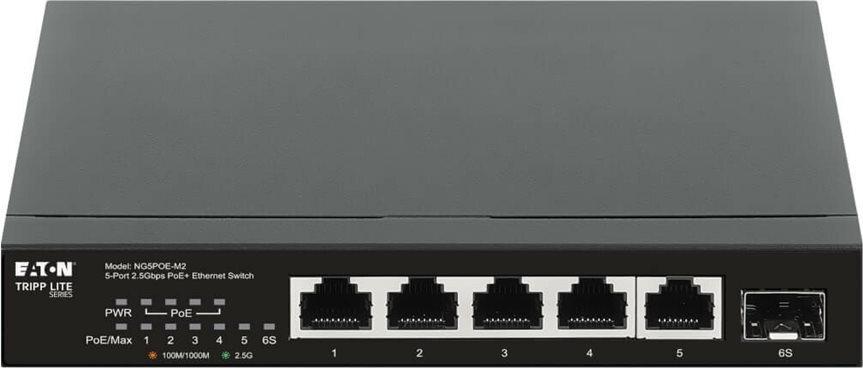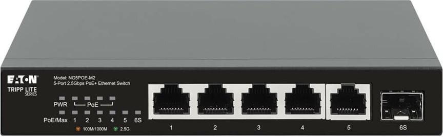 Der Desktop-Gigabit-Ethernet-Unmanaged-Switch der Eaton Tripp Lite-Serie bietet eine zuverlässige Lösung zur einfachen Verbesserung der Netzwerkkonnektivität. Mit fünf 2,5-Gigabit-Ethernet-Ports ermöglicht dieser Switch eine Datenübertragung mit einer Port-Switching-Kapazität von 45 Gbit/s und einer Switching-Kapazität von 5 Gbit/s, wodurch mehrere Geräte gleichzeitig bedient werden können. Mit Power over Ethernet (PoE+) kann der Switch bis zu 70 W Leistung über die Kabel liefern und eignet sich somit ideal für die Stromversorgung von Geräten wie IP-Kameras und Wireless Access Points, ohne dass zusätzliche Netzteile erforderlich sind. Der Switch ist vielseitig einsetzbar und eignet sich für die Installation auf dem Schreibtisch oder an der Wand. Er verfügt über ein lüfterloses Design und ein robustes Metallgehäuse, das einen leisen Betrieb bei gleichbleibender Langlebigkeit gewährleistet. Er arbeitet effizient unter verschiedenen Umgebungsbedingungen mit einem Betriebstemperaturbereich von 0 °C bis 40 °C und Lagertemperaturen von -40 °C bis 70 °C. Benutzer können sich auf die Plug-and-Play-Einrichtung und die Einhaltung verschiedener Standards verlassen, wodurch die Bereitstellung schnell und unkompliziert ist.