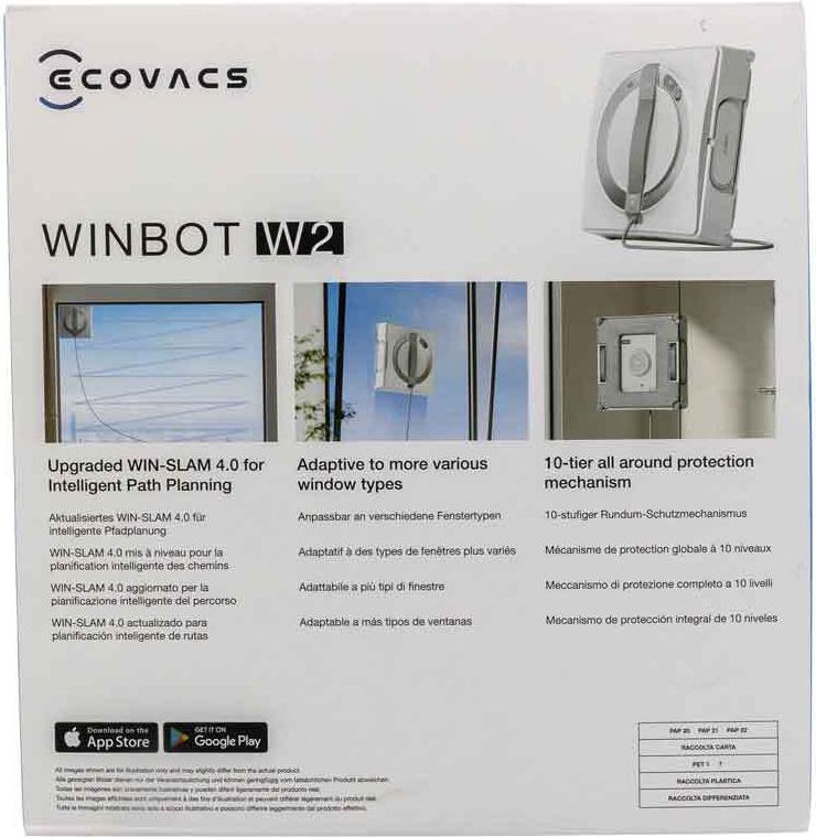 Der WINBOT W2 ist mit automatischer Kreuzsprühtechnologie von ECOVACS, verbesserter WIN-SLAM 4.0-Technologie und 10-fachem Rundumschutz ausgestattet. Er bietet ein effizientes und leistungsstarkes Reinigungserlebnis, dank der rundum optimierten Drei-Düsen-Weitwinkel-Sprühtechnik mit Nassmopp und des 230ml-Behälters.