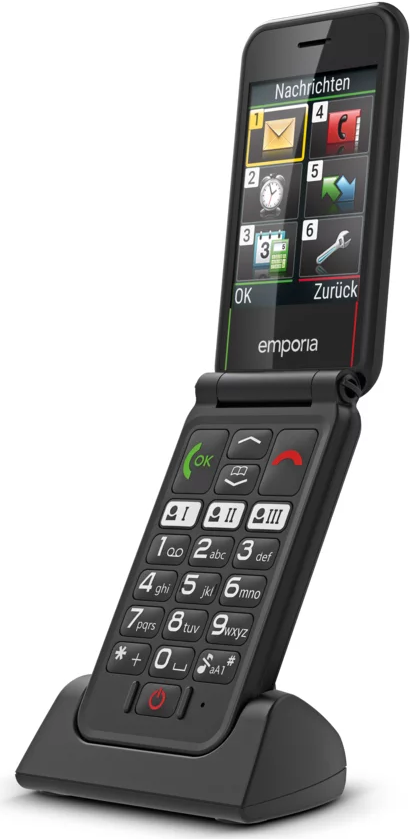 Nein, nicht Klappe halten. Wir erzählen es gerne weiter, dass wir uns in dieses schicke Tastenhandy mit Klappe namens emporiaSIMPLICITYglam verliebt haben. Denn schöner, einfacher und zugleich sicherer war ein Klappenhandy aus unserer Überzeugung bisher nicht.Simpel heißt einfach. Einfach ist gut. Und gut ist das neue emporiaSIMPLICITYglam mit Klappe, hochwertiger Ausführung und in schickem Design.Das SIMPLICITYglam kommt ohne jeglichen Schnickschnack aus. Emporia hat bei diesem modernen Tastenhandys das Telefonieren in das Zentrum gerückt. Und das funktioniert bestens dank Schnellwahltasten, einfacher Bedienung, extragroßen Tasten (beleuchtet, erhaben und mit ausgezeichnetem Druckpunkt), individuell verstellbarer Schriftgröße und breitem Bildschirm mit gut lesbarer Schrift.Das Telefon ist IP54-zertifiziert (staub- und spritzwasserfest) und besonders auch für Träger eines Hörgerätes geeignet (M4/T4).Auf der Rückseite ist das Telefon mit der bewährten, patentierten emporia-Notfall-Taste ausgestattet, mit der schnell und unkompliziert Hilfe verständigt werden kann. Einfach die Taste mit dem Herz drücken, und schon wird die Rettungskette aktiviert.Nützliche Funktionen sind u.a. Wecker mit Schlummerfunktion, Vibrationsalarm, Kalender, Taschenrechner und LED-Statusleuchten (für Akku, Anruf, SMS)Im Lieferumfang enthalten sind u.a. die praktische Ladeschale, Kopfhörer, Bedienungsanleitung und ein austauschbarer Li-Ion-Akku.Hauptmerkmale