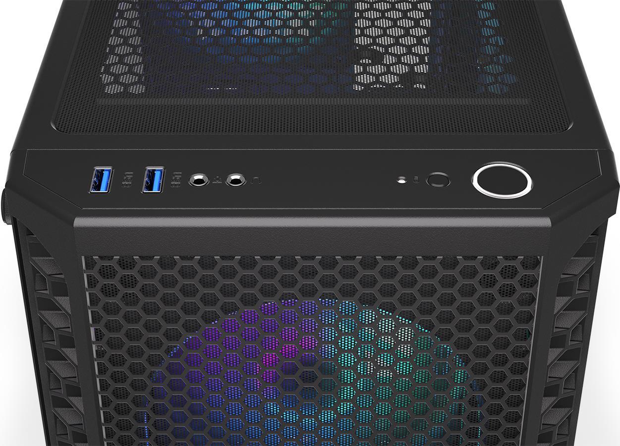 | Systemgehäuse-Merkmale | Gitterfrontabdeckung, Kabelführungssystem, unterstützt Radiator (120 mm) in der Rückseite, magnetischer Staubfilter am Boden, magnetischer Staubfilter vorn, Support für 120/240 mm Radiator oben, magnetischer Staubfilter oben, unterstützt 120/240/360 mm Radiator in Vorderwand, ARGB-Controller, Power-Taste, elastische HDD/SSD-Halterung, Reset/LED-Taste |