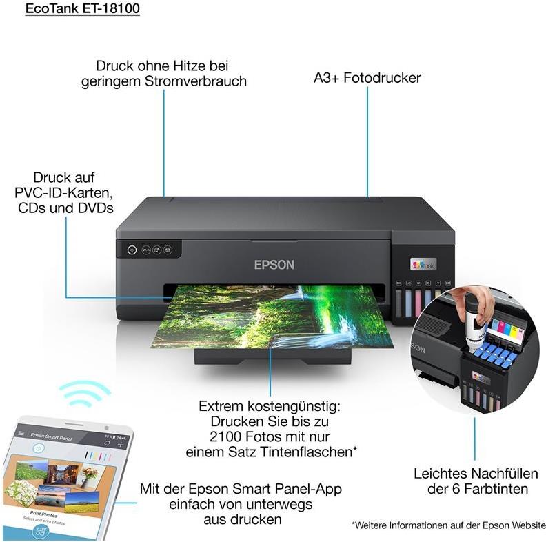 Aufgrund der extrem geringen Kosten pro Foto und der Möglichkeit zum mobilen Drucken eignet sich dieser schnelle patronenlose Tintenstrahldrucker optimal für den auflagenstarken Fotodruck im Format A3 und größer. Sein geringer Platzbedarf, die Tintenflaschen mit Schlüssel-Schloss-Prinzip und die an der Vorderseite liegenden Tintentanks erleichtern das Nachfüllen der Tinte und machen den ET-18100 zu einer platzsparenden und anwenderfreundlichen Drucklösung. Das Gerät verarbeitet eine Vielzahl an Medien und bedruckt auch PVC-Ausweise sowie CDs und DVDs.