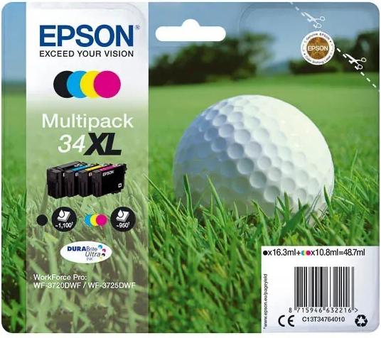 Erzielen Sie hochwertige Dokumente mit dem wirtschaftlichen Tintenset der Serie 34. Es erzeugt wasser-, wisch- und textmarkerfeste Dokumente mit professionellem Erscheinungsbild. Die schnell trocknenden Tinten eignen sich ideal für doppelseitiges Drucken, und mit den preiswerten Standard- oder XL-Patronen lässt sich jede Art von Druckaufkommen bewältigen. Mit dem Golfball auf der Verpackung können Sie unsere Tintensets im Laden auf einen Blick finden.