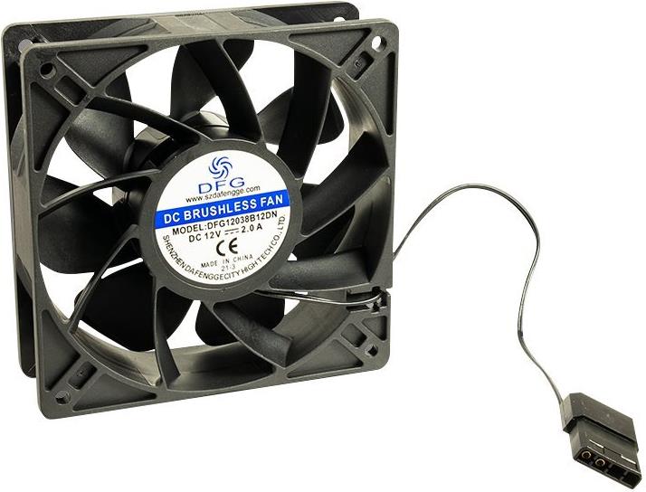 Der DFG12038B12DN ist ein 120 mm Lüfter mit einem hohen statischen Luftdruck von 31,10 mm mm-H2O und einem Luftdurchsatz von 332,50 cbm/h bei 5500 U/min.Er ist der ideale Kandidat für den Einsatz in Systemen, bei denen sehr viel Wärme im Betrieb entsteht, wie z. B. wenn eine Vielzahl an Grafikkarten auf engstem Raum verbaut werden müssen.