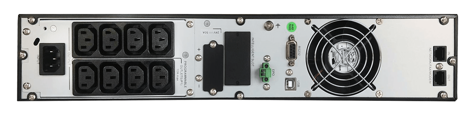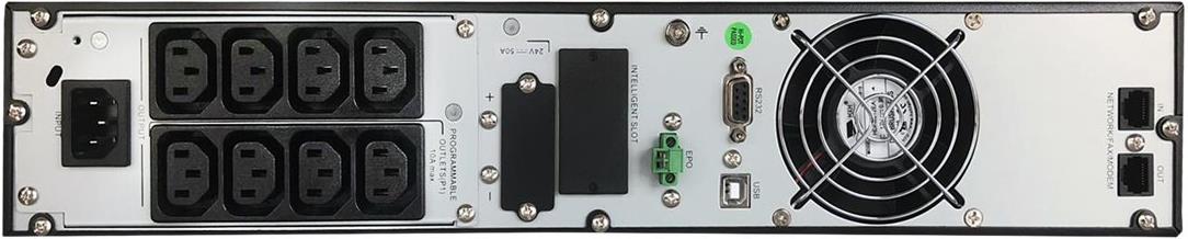 | Besonderheiten | Integrierter Lüfter, hörbarer Alarm, interner Bypass, im Betrieb austauschbare Akkus, Eco-Mode, drehbares LCD-Panel, Doppelwandlerprinzip, programmable outlet bank |