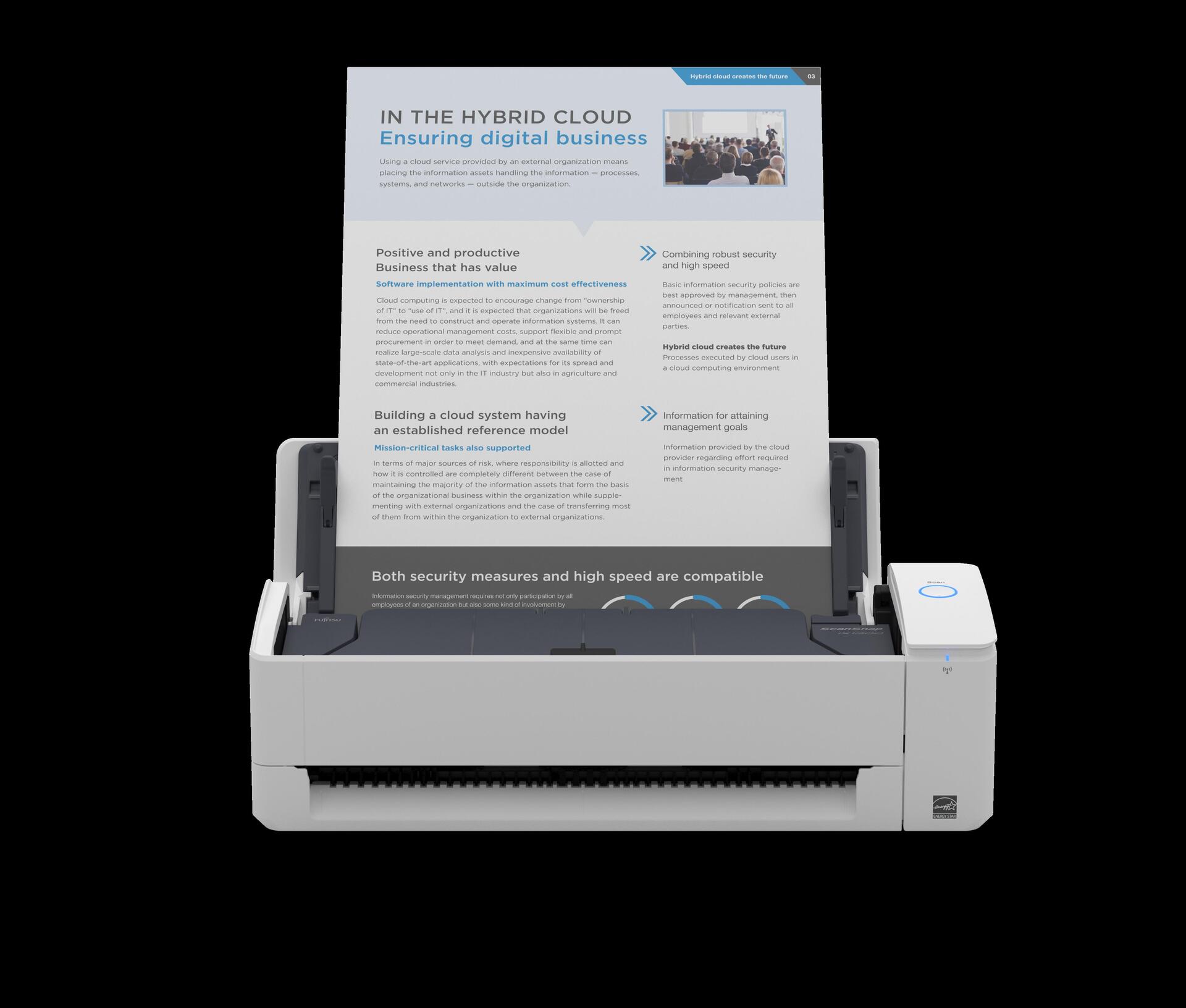 Die moderne Arbeitswelt ist dynamisch. Menschen arbeiten oft auf begrenztem Raum oder an verschiedenen Orten. Der intelligente und kompakte iX1300 findet in jedem Büro oder im Homeoffice Platz und hilft Ihnen dabei, produktiv zu sein - unabhängig davon, von wo aus Sie Ihrer Tätigkeit nachgehen. Der Dokumenteneinzug des iX1300 minimiert den Platzbedarf und macht ihn zum bisher kompaktesten Desktop-Scanner. WLAN-Konnektivität und PC-freies Scannen in Cloud-Dienste über die ScanSnap-Cloud ermöglichen eine effizientere Art der Arbeit. Der iX1300 bietet darüber hinaus zeitsparende Funktionen zur Steigerung der Effizienz. Ohne langes Hochfahren ist der Scanner in Sekundenschnelle einsatzbereit. Außerdem können Sie dank der Rücklauffunktion einzelne Blätter scannen, ohne den Deckel zu öffnen. Ein 20 Blatt ADF und eine Scangeschwindigkeit von 30 Blatt (60 Seiten) pro Minute lassen keine Wünsche offen. Mit der intuitiven ScanSnap-Home-Software können Sie die vorhandenen Dokumente ganz einfach in die gewünschten digitalen Formate umwandeln. So haben Sie mehr Kontrolle über Ihre Verwaltungsaufgaben und können sich auf die Dinge konzentrieren, die Ihnen wirklich wichtig sind. Der iX1300 ist der bisher kompakteste Scanner, der die persönliche Produktivität steigert und papierbasierte Dokumente für Sie und Ihr Unternehmen nutzbar macht.