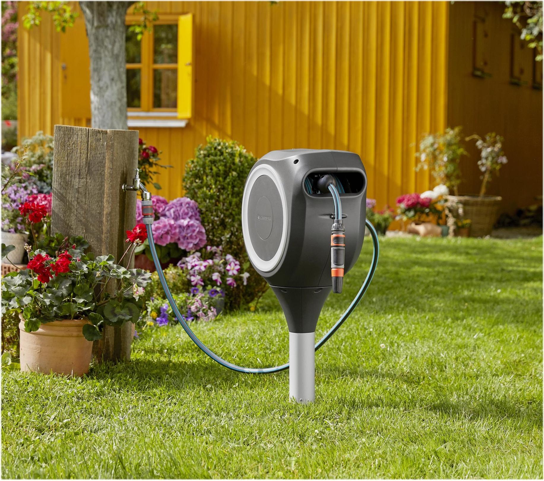 Wasser marsch! Wann immer Du willst: Die Gardena Garten-Schlauchbox RollUp S ist keine gewöhnliche Schlauchaufbewahrung, die lediglich zur Lagerung des Gartenschlauchs dient. Mit dieser kompakten Garten-Schlauchbox kannst Du ganz bequem Deinen kleinen Garten gießen und hast dabei maximale Bewegungsfreiheit. Die Schlauchbox steht auf einem robusten Standfuß und Du kannst sie einfach an einem beliebigen Ort in Deinem Garten installieren. Der Erdspieß wird mithilfe einer Montagestange in die Erde eingedreht und ist dadurch äußerst standhaft. Für den Gebrauch ziehst Du den Gartenschlauch einfach bis maximal 15 Meter aus und kannst sofort mit der Bewässerung loslegen. Die eingebauten kurzen Arretierstops sorgen für eine mühelose Handhabung und fixieren den Schlauch automatisch an der gewünschten Ausziehlänge.