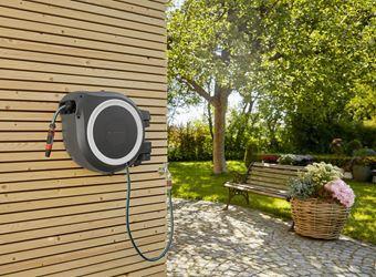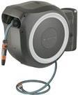 Wasser marsch! Wann immer Du willst: Mit Hilfe der Wand-Schlauchbox RollUp M/L wird das Bewässern Deines Gartens zu einem komfortablen Vergnügen. Diese Wand-Schlauchbox erspart Dir lästiges Kurbeln, schmutzige Hände und einen verknoteten Schlauch. An einer beliebigen Wand montiert, wird Dein Gartenschlauch sicher und äußerst platzsparend aufbewahrt. Für den Einsatz ziehst Du den 25 Meter langen Schlauch einfach auf die gewünschte Länge aus. Sobald Du stehen bleibst, greifen die besonders kurzen Arretierstops und fixieren den Gartenschlauch. Dank der praktischen Wandhalterung ist die Schlauchtrommel um 180° schwenkbar und folgt Deinen Bewegungen im Garten unbemerkt. Auf diese Weise kannst Du Deine Bewässerungsarbeit mühelos erledigen, hast dabei maximale Bewegungsfreiheit und der Schlauch knickt nicht ab. Zum Aufrollen des Schlauchs ist weder Bücken noch Kurbeln nötig: Ein leichter Zug am Schlauchende genügt und die Arretierung löst sich. Die hochwertige Stahlfeder im Inneren der Box rollt den Schlauch daraufhin automatisch, zuverlässig und gleichmäßig für Dich ein. Eine innovative RollControll-Technologie sorgt für einen sicheren und kontrollierten Einzug. Dank der integrierten Schlauchführung entstehen keine Knoten oder Knicke beim Aufrollen, sodass Beschädigungen des Gartenschlauchs verhindert werden. Durch die Hahn- und Schlauchanschlüsse aus dem Original Gardena System kannst Du den Schlauch flexibel verlängern oder andere Gardena Bewässerungsaufsätze anbringen. Deine Gardena Schlauchaufsätze hast Du außerdem immer griffbereit: Sie lassen sich unterhalb der Wandhalterung befestigen und können dort platzsparend aufbewahrt werden. Das hochwertige Material wird sowohl durch einen UV- als auch einen Frostschutz gegen die verschiedenen Wettereinflüsse geschützt und ist so ganzjährig einsetzbar. Zusätzlich ist die Box mit einem Diebstahlschutz ausgestattet. Die Schlauchbox kommt mit allen notwendigen Anschlussteilen: Wandhalterung, einem flexiblen Verbindungsschlauch, allen benötigten Original Gardena System- und Montageteilen sowie einer Spritze mit zwei verschiedenen Sprühstrahloptionen.
