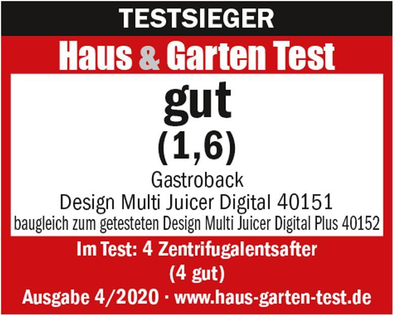 Mit einem Glas frisch bereiteten Saftes fühlen Sie sich energiegeladener und konzentrierter. Das besondere Plus: wenn Sie Obst und Gemüse selbst pressen, wissen Sie genau was darin ist. Sie trinken nur die reinen Zutaten in Form von Frucht, Gemüse oder grünen Blättern - frei von Industriezucker oder anderen Zusatzstoffen. Probieren Sie verschiedene Kombinationen Ihrer Lieblingszutaten aus, Sie finden bestimmt den perfekten Saft. Schnell und einfach gelingt dies mit dem Design Multi Juicer Digital von Gastroback. Der 1.300 Watt starke Profi-Motor ist elektronisch geregelt und schafft auch harte Gemüsesorten oder Gewürzwurzeln, wie Ingwer, mühelos. Dabei schluckt der XXL Einfüllschacht mit einem Durchmesser von 84?mm auch unzerkleinerte Früchte, das zeitaufwendige Vorschneiden entfällt. Dank der großen Saftbox und des 2?Liter fassenden Tresterbehälters können in einem Entsaftungsvorgang bis zu 1,2?Liter Saft gewonnen werden. Dabei verhindert der Saftauslauf mit Spritzschutz und Tropfstopp Nachtropfen und sorgt so für eine saubere Arbeitsfläche. Auch das anschließende Reinigen geht schnell und einfach, da alle relevanten Teile spülmaschinengeeignet sind.Produkttext[/head]Design Multi Juicer Digitalfrisch & selbst gemachtFrische, selbst gemachte Säfte - für einen gesunden Start in den TagMit einem Glas frisch bereiteten Saftes fühlen Sie sich energiegeladener und konzentrierter. Das besondere Plus: wenn Sie Obst und Gemüse selbst pressen, wissen Sie genau was darin ist. Sie trinken nur die reinen Zutaten in Form von Frucht, Gemüse oder grünen Blättern – frei von Industriezucker oder anderen Zusatzstoffen. Probieren Sie verschiedene Kombinationen Ihrer Lieblingszutaten aus, Sie finden bestimmt den perfekten Saft. Schnell und einfach gelingt dies mit dem Design Multi Juicer Digital von Gastroback®. Der 1.300 Watt starke Profi-Motor ist elektronisch geregelt und schafft auch harte Gemüsesorten oder Gewürzwurzeln, wie Ingwer, mühelos. Dabei schluckt der XXL Einfüllschacht mit einem Durchmesser von 84?mm auch unzerkleinerte Früchte, das zeitaufwendige Vorschneiden entfällt. Dank der großen Saftbox und des 2?Liter fassenden Tresterbehälters können in einem Entsaftungsvorgang bis zu 1,2?Liter Saft gewonnen werden. Dabei verhindert der Saftauslauf mit Spritzschutz und Tropfstopp Nachtropfen und sorgt so für eine saubere Arbeitsfläche. Auch das anschließende Reinigen geht schnell und einfach, da alle relevanten Teile spülmaschinengeeignet sind.[head]Hauptmerkmale