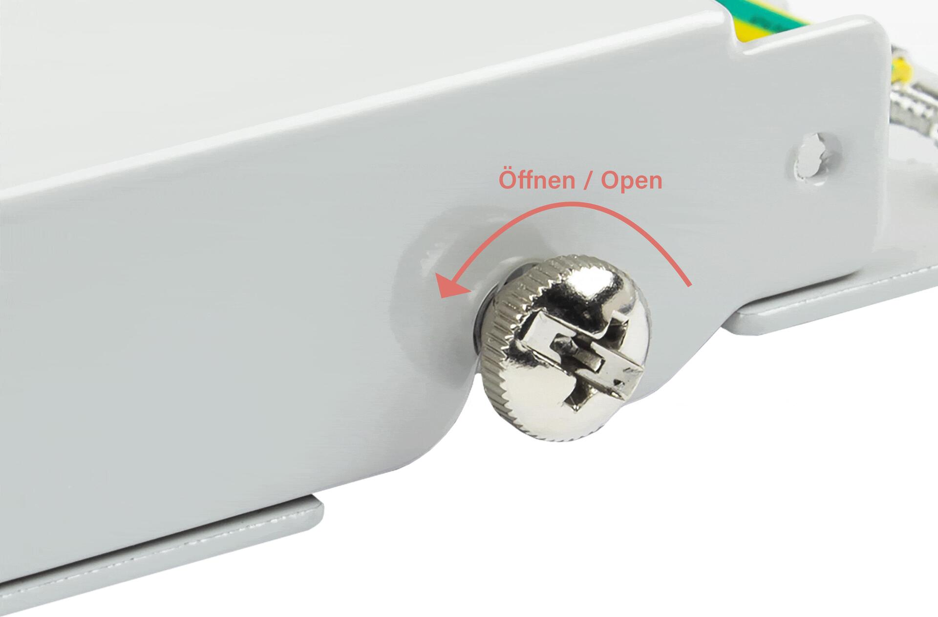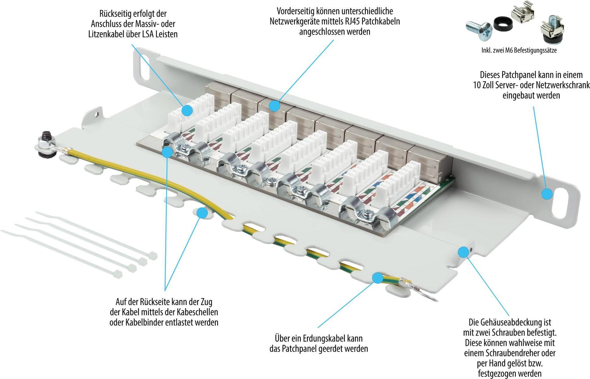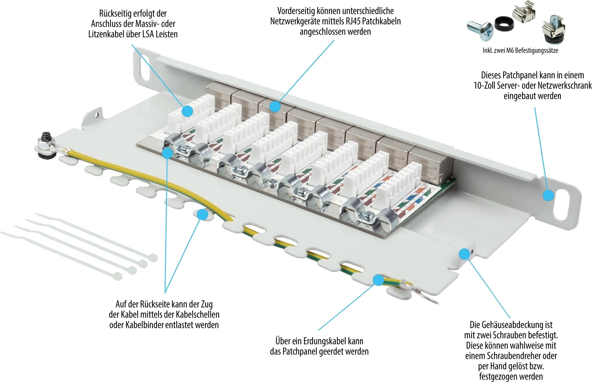 Das vollgeschirmte Cat. 6A Patchpanel von Good Connections® ist aus stabilem 1,5 mm Stahlblech gefertigt und für Ethernet-Netzwerke bis 10 Gigabit/s geeignet. Vorderseitig können unterschiedliche Netzwerkgeräte mittels RJ45 Patchkabeln angeschlossen werden. Rückseitig erfolgt der Anschluss der Massiv- oder Litzenkabel über LSA Leisten. Werkzeugloses Öffnen und Schließen Die Gehäuseabdeckung ist mit zwei Schrauben befestigt. Diese können wahlweise mit einem Schraubendreher oder per Hand gelöst bzw. festgezogen werden.