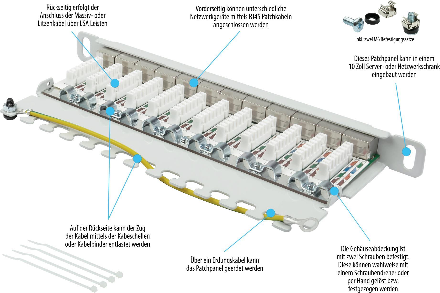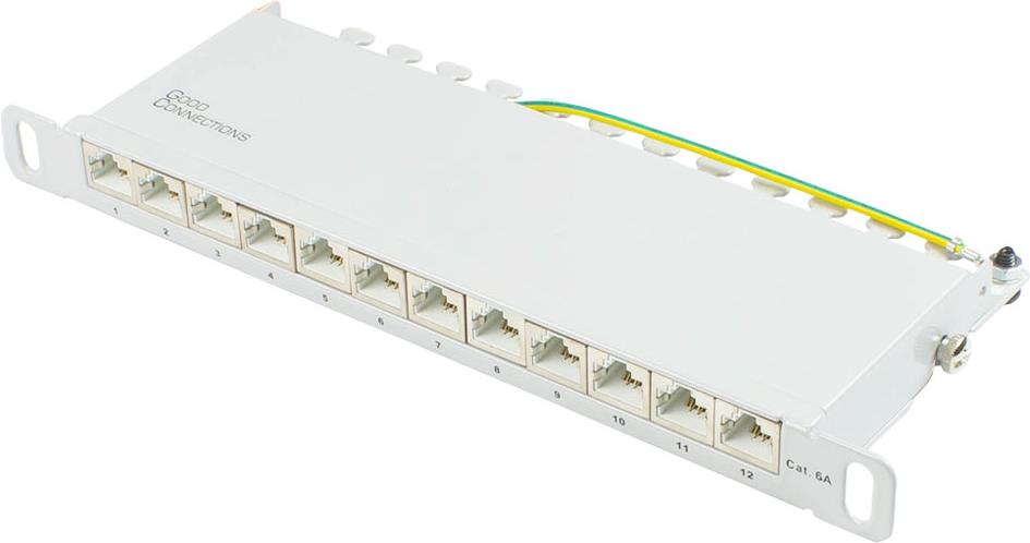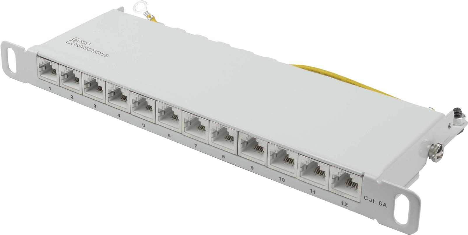 Das vollgeschirmte Cat. 6A Patchpanel von Good Connections ist aus stabilem 1,5 mm Stahlblech gefertigt und für Ethernet-Netzwerke bis 10 Gigabit/s geeignet. Vorderseitig können unterschiedliche Netzwerkgeräte mittels RJ45 Patchkabeln angeschlossen werden. Rückseitig erfolgt der Anschluss der Massiv- oder Litzenkabel über LSA Leisten.Produkttext[/head]Das vollgeschirmte Cat. 6A Patchpanel von Good Connections® ist aus stabilem 1,5 mm Stahlblech gefertigt und für Ethernet-Netzwerke bis 10 Gigabit/s geeignet. Vorderseitig können unterschiedliche Netzwerkgeräte mittels RJ45 Patchkabeln angeschlossen werden. Rückseitig erfolgt der Anschluss der Massiv- oder Litzenkabel über LSA Leisten.Werkzeugloses Öffnen und SchließenDie Gehäuseabdeckung ist mit zwei Schrauben befestigt. Diese können wahlweise mit einem Schraubendreher oder per Hand gelöst bzw. festgezogen werden.[head]Hauptmerkmale