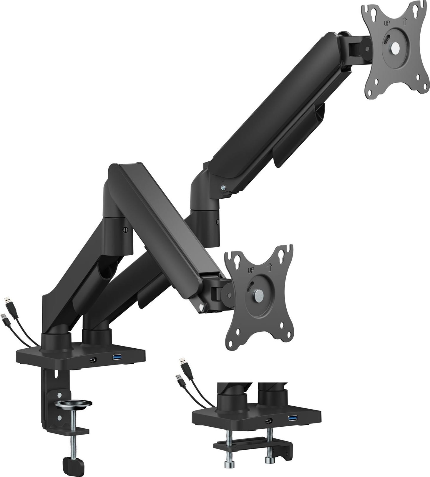 Das Gembird-Montageset verfügt über einen verstellbaren Arm, der eine flexible Anbringung von zwei Flachbildschirmen mit einer Größe von 17 bis 32 Zoll ermöglicht. Dank integrierter USB-A- und USB-C-Anschlüsse bietet diese Halterungslösung einfachen Zugang zu Lade- und Anschlussmöglichkeiten. Das Design umfasst ein integriertes Kabelmanagementsystem, das für Ordnung und Übersichtlichkeit an Ihrem Arbeitsplatz sorgt. Die robusten Stahl- und Kunststoffmaterialien, die bei der Konstruktion verwendet wurden, gewährleisten Langlebigkeit, während die pulverbeschichtete Oberfläche die Ästhetik unterstreicht. Stellen Sie die Neigung, Drehung und Schwenkbarkeit des Displays von -90° bis 90° sowie von -180° bis 180° ein und sorgen Sie so für Komfort und optimale Betrachtungswinkel. Die Installation ist unkompliziert, da im Lieferumfang Optionen für eine Tischklemme oder eine Durchführungshalterung enthalten sind.