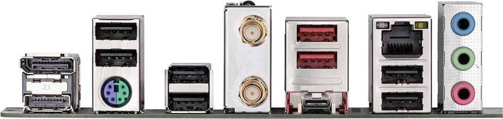 | Schnittstellen | 1 x HDMI 1 x DisplayPort 6 x USB 2.0 2 x USB 3.2 Gen 2 1 x USB-C 3.2 Gen 1 1 x LAN (Gigabit Ethernet) 1 x Audio Line-Out - Mini-Klinkenstecker 1 x Audio Line-In - Mini-Klinkenstecker 1 x Mikrofon - Mini-Klinkenstecker 1 x PS/2-Tastatur/-maus 2 x Antenne |