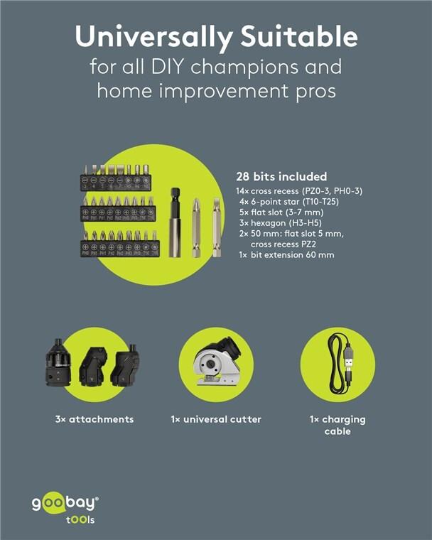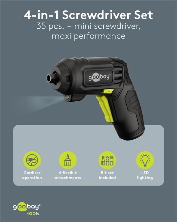 • Goobay 4in1 Mini-Akkuschrauber-Set 35-tlg. - in Pistolenform mit 4 Vorsätzen und (77817)