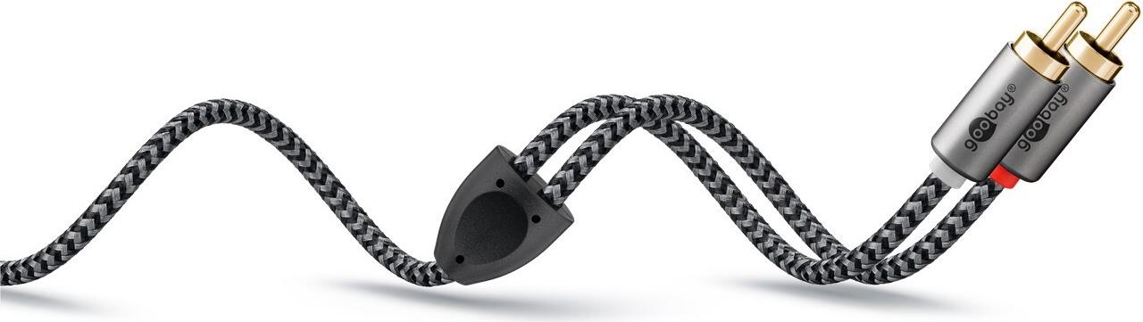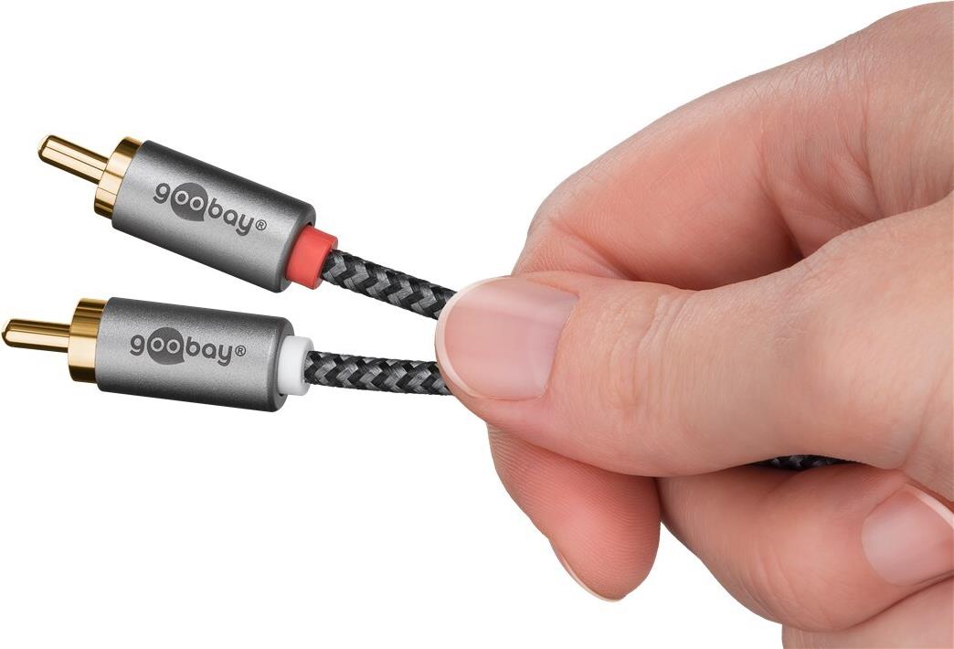 Goobay 65292. Anschluss 1: 2 x RCA, Steckverbinder 1 Geschlecht: Männlich, Anschluss 2: 2 x RCA, Steckverbinder 2 Geschlecht: Männlich, Kabelmaterial: Kupfer, Beschichtung Steckerkontakte: Gold, Magnetisch abgeschirmt, AWG Kabelgröße: 28, Kabellänge: 1 m, Produktfarbe: Grau (65292)