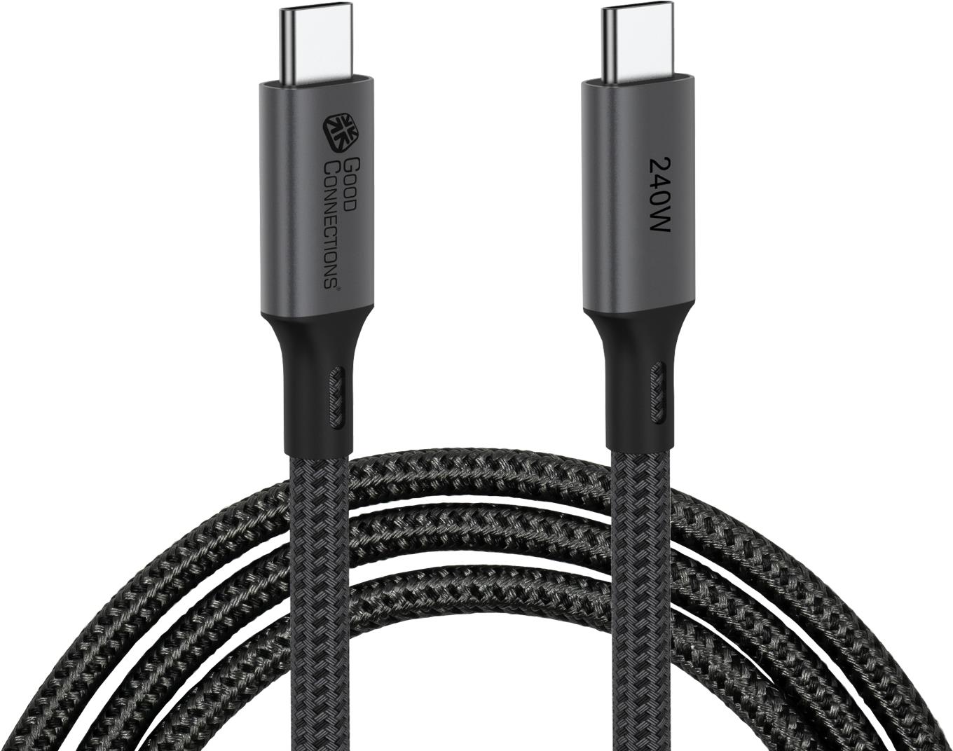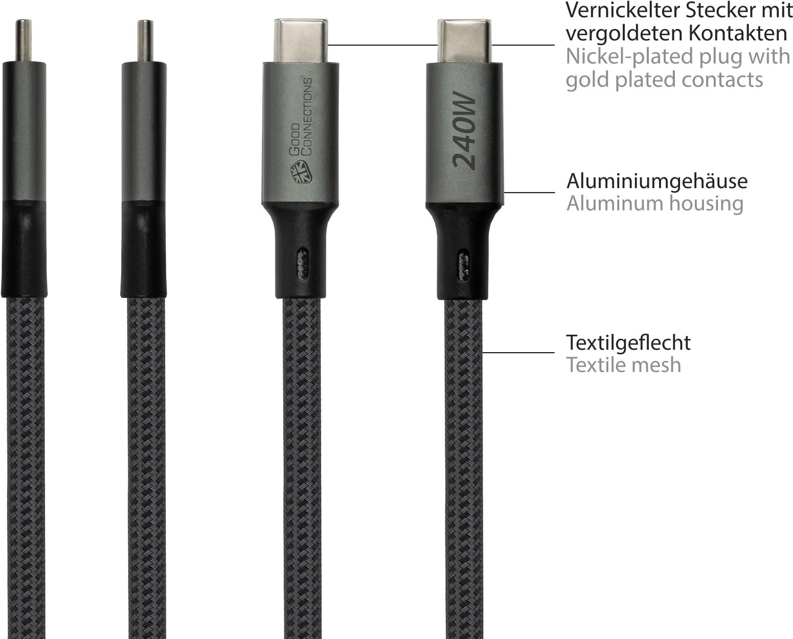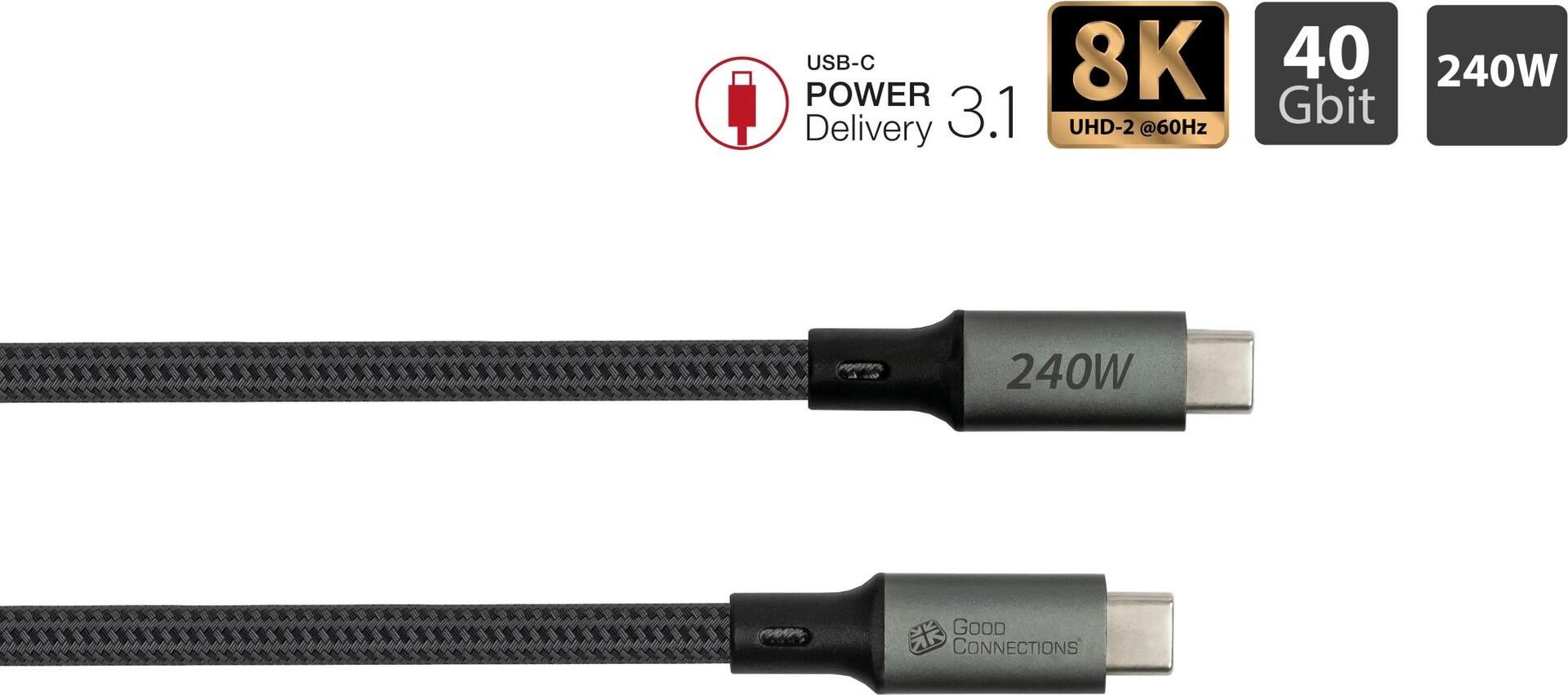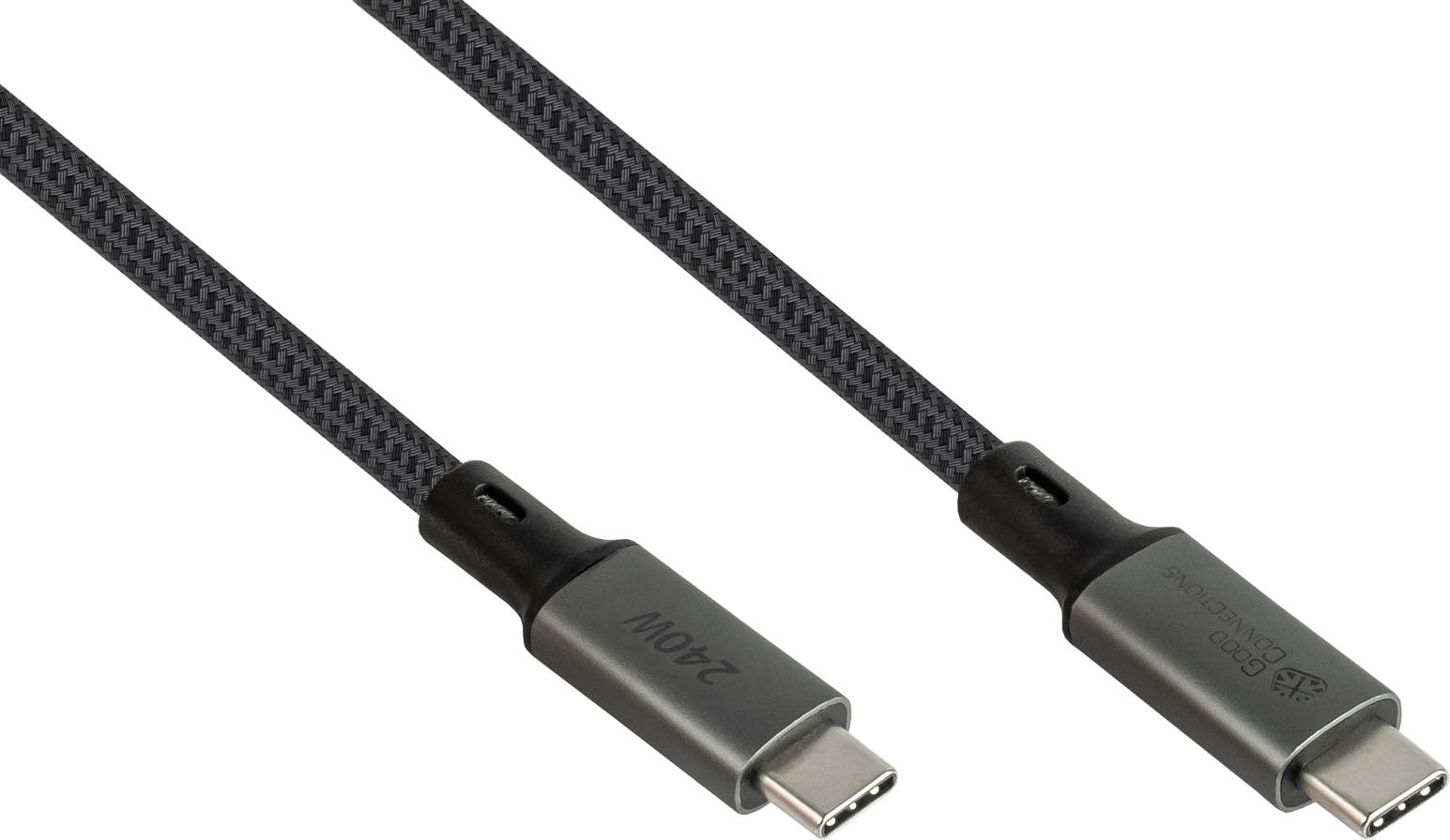 Good Connections USB 4.0 Gen. 3x2 Kabel 40GBit/s 240W 8Ka60Hz USB-C Stecker an - Mit dem hochwertig verarbeiteten und USB-IF zertifizierten USB 4.0 Gen. 3x2 Kabel von Good Connections® können Sie Ihre USB-C™-Geräte nicht nur mit bis zu 240 Watt in kürzester Zeit aufladen - sondern übertragen zeitgleich mühelos und mit beeindruckender Geschwindigkeit von bis zu 40 Gbit/s Daten. Zudem bietet es durch 8K Ultra HD Unterstützung ein erstklassiges Bilderlebnis.<br /> <br /> <b>Hochwertige Verarbeitung und edles Design</b><br /> Das Good Connections® USB 4.0-Kabel ist mit seinem eleganten und robusten Textilgeflecht und seinen stabilen Vollmetallanschlüssen ein stets zuverlässiger Begleiter und ein echter Blickfang. Das herausragend verarbeitete Kabel ist flexibel und stabil zugleich. Ausgewählte - hochwertige Materialien sorgen für eine lange Nutzungsdauer - selbst bei täglichem Gebrauch.<br /> <br /> <b>Universelle Konnektivität und beeindruckende 40-Gbit/s Datenübertragung</b><br /> Dieses High-End USB-Kabel ermöglicht in Verbindung mit USB 4.0 kompatiblen Geräten sehr hohe Datenübertragungsraten von bis zu 40 Gbit/s. Übertragen Sie selbst große Videodateien in kürzester Zeit zwischen verschiedenen Geräten. Selbstverständlich ist es zeitgleich abwärtskompatibel zu den bisherigen USB-Versionen. Machen Sie Schluss mit einer Vielzahl unterschiedlicher Kabel und verbinden Sie mit dem Good Connections® USB 4.0 Kabel mühelos und per Plug-and-Play Ihren Mac - MacBook - iPad - Notebook - Chromebook - Surface und viele weitere USB-C™ Geräte.<br /> <br /> <b>Gestochen scharfe (2404-TK005A)