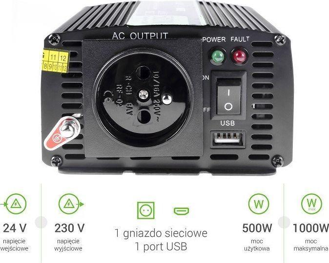 Der Wechselrichter ist ein Gerät, das eine Gleichspannung aus dem Autobatterie- oder Autoanzünder in eine Wechselspannung von ~230V umwandelt. Genau das gleiche Signal ist in jedem Stromstecker (Typ E) in Europa. Der Wechselrichter ist eine ausgezeichnete Wahl für alle, die mit dem Auto, einem Wohnmobil oder einem LKW unterwegs sind. Er ist perfekt für Orte ohne direkten Zugang zu Steckdosen.