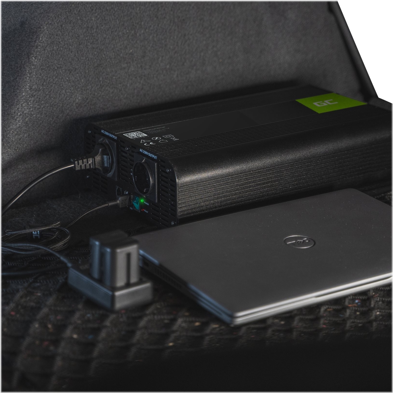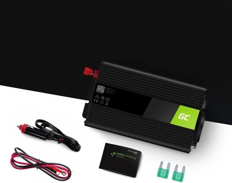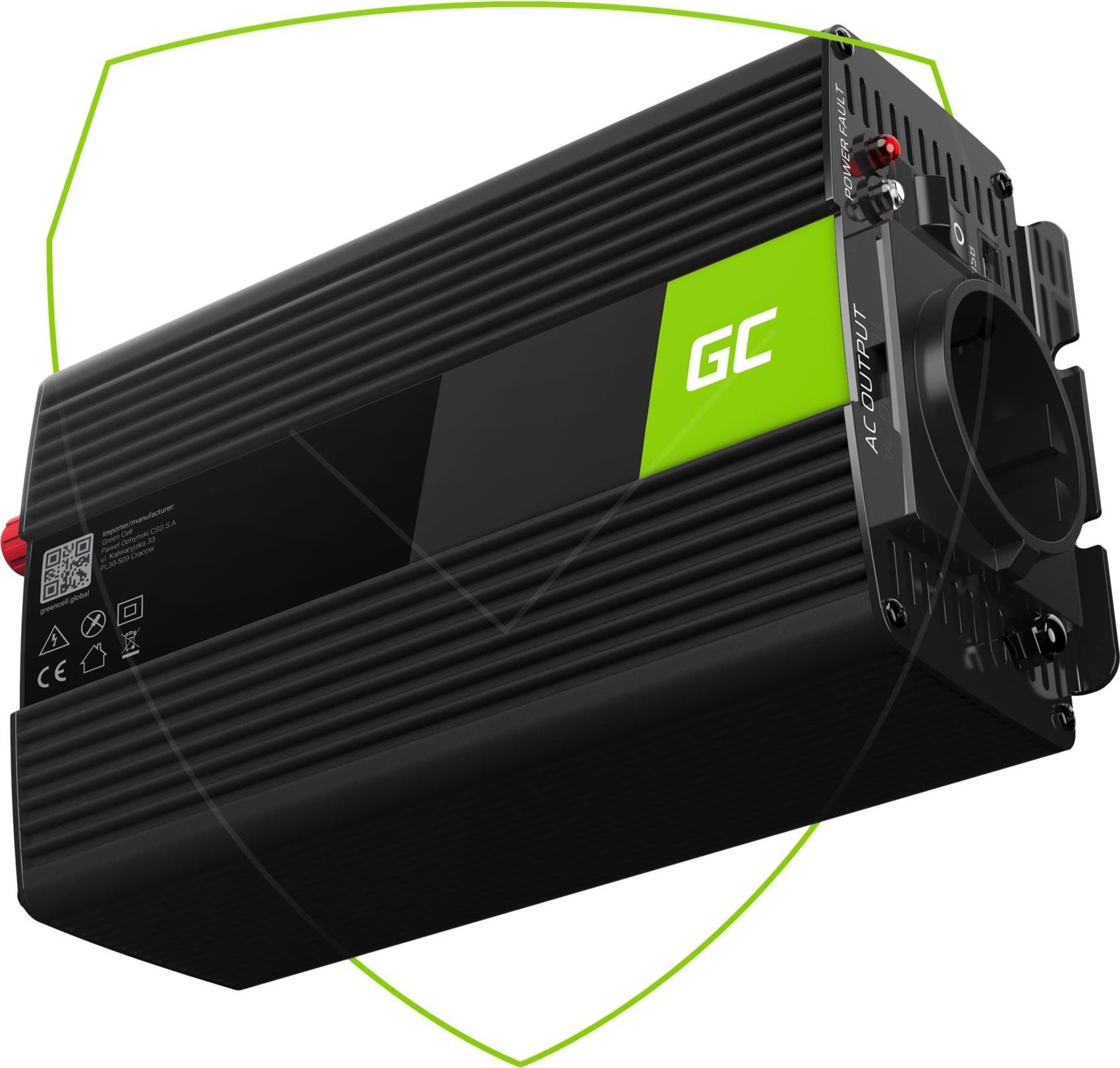 Green Cell INV05DE. Zweck: Universal, Netzteiltyp: Auto, Eingangsspannung: 12 V. Produktfarbe: Schwarz, Kühlung: Aktiv. Breite: 106 mm, Tiefe: 175 mm, Höhe: 60 mm. Menge pro Packung: 1 Stück(e), Mitgelieferte Kabel: Gleichstrom (INV05DE)