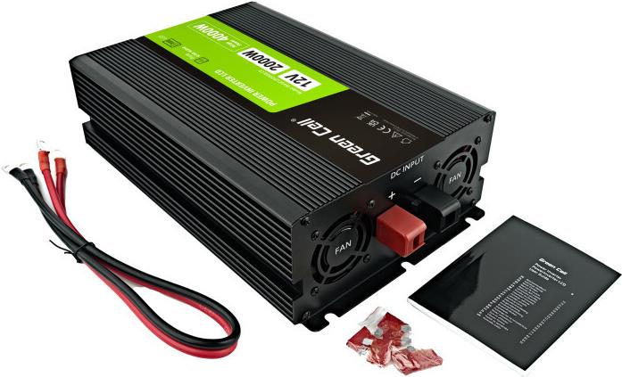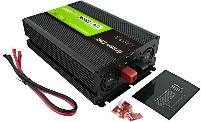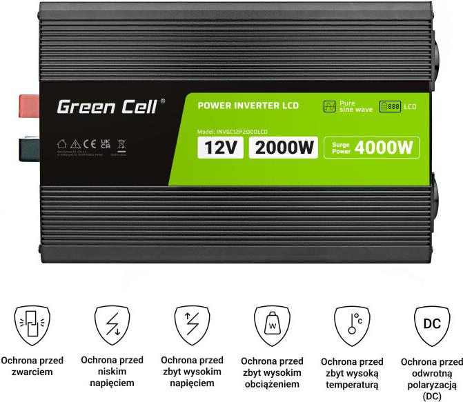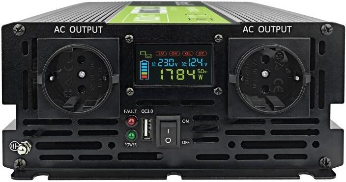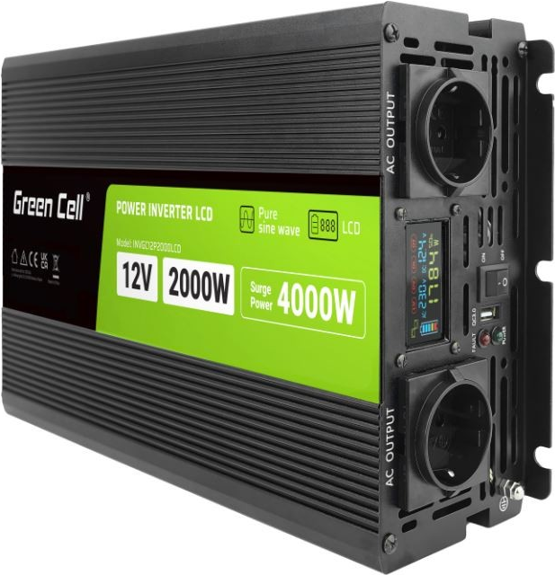 Green Cell PowerInverter LCD 12 V 2000 W/40000 W Reiner Sinus-Wechselrichter mit LCD Display. Zweck: Auto-Wechselrichter, Netzteiltyp: Auto, Eingangsspannung: 12 V. Produktfarbe: Schwarz, Gehäusematerial: Aluminium, Kühlung: Aktiv (INVGC12P2000LCD)