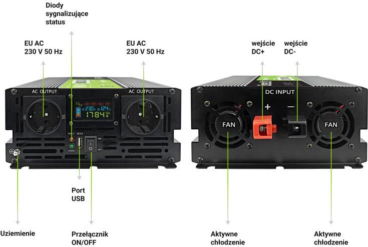 Der Green Cell DC-zu-AC-Wechselrichter wandelt 12-V-Gleichstrom in 230-V-Wechselstrom um und eignet sich somit für verschiedene Anwendungen. Mit einer Ausgangsleistung von 2000 Watt kann dieser Wechselrichter eine Vielzahl von Geräten und Anwendungen effizient versorgen. Er verfügt über eine reine Sinuswellenausgangswellenform, die sicherstellt, dass empfindliche Elektronikgeräte mit sauberer und stabiler Energie versorgt werden.