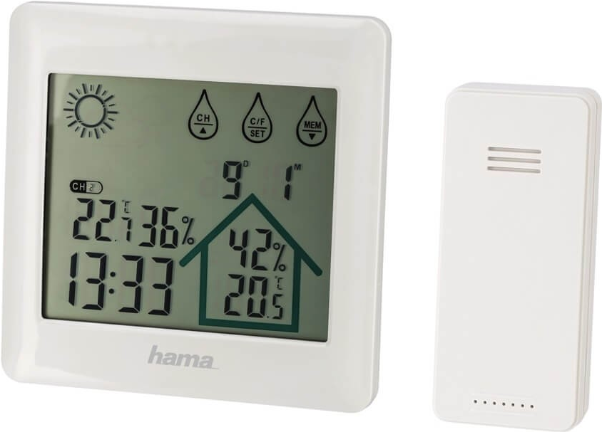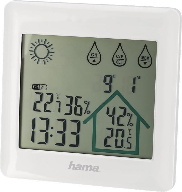 Hama Action. Produktfarbe: Weiß, Messfunktionen: Innen-Hygrometer, Innen-Thermometer, Außen-Hygrometer, Außen-Thermometer, Feuchtigkeitmessbereich (aussen) (H-H): 20 - 95%. Energiequelle: Batterie/Akku, Akku-/Batterietyp: AAA Micro. Breite: 120 mm, Tiefe: 20 mm, Höhe: 120 mm. Anzahl enthaltener Batterien: 5 Stück(e) (00186412)
