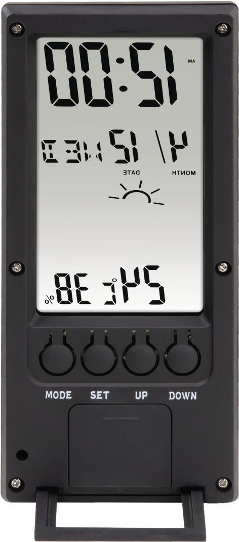 - digitale transparente Displayanzeige von Temperatur, Luftfeuchtigkeit, Uhrzeit und aktueller Wetterlage