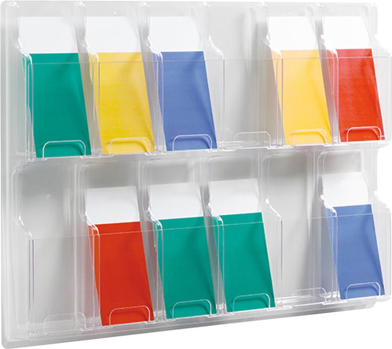 helit Wanddisplay Clearly, 12 Fächer 1/3 DIN A4, glasklar Fachtiefe: 45 mm, aus PETG (mit Glycol modifiziertes Polyethylen Teraphtalat), recycelfähig, Maße: (B)762 x (T)51 x (H)518 mm (H6259802)