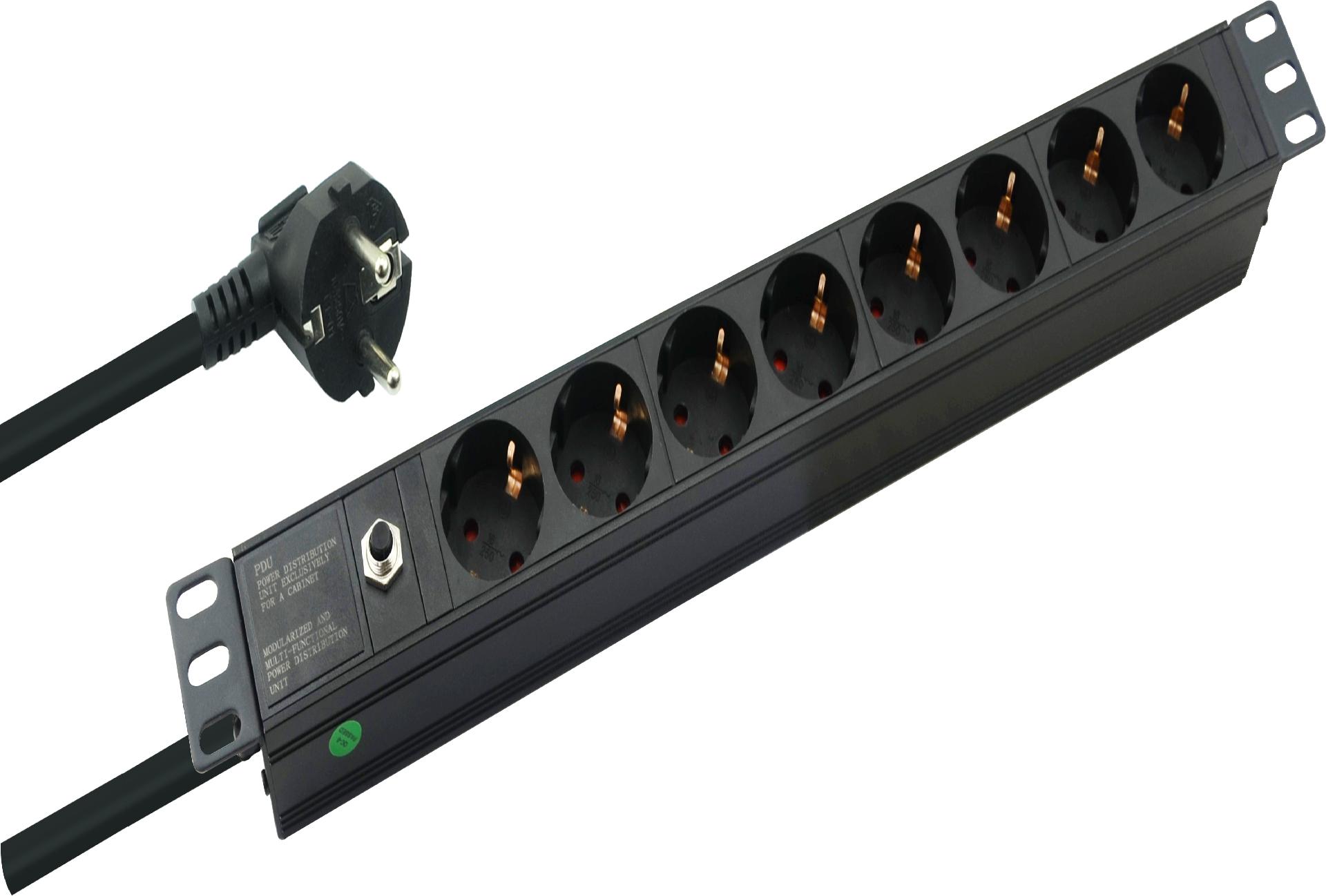 Helos 48,30cm (19") Steckdosenleiste PROFESSIONAL, 8-fach, schwarz, 2,0m, ohne Schalter 48,30cm (19") PDU-Leiste für professionelle Anwendungen , 2,0m Zuleitung , 1 HE , mit Überspannungsschutz (ÜSS) , Aluminium-Gehäuse , Leiterquerschnitt: 1,5 ...