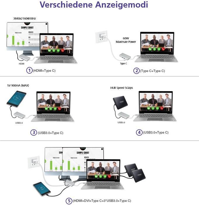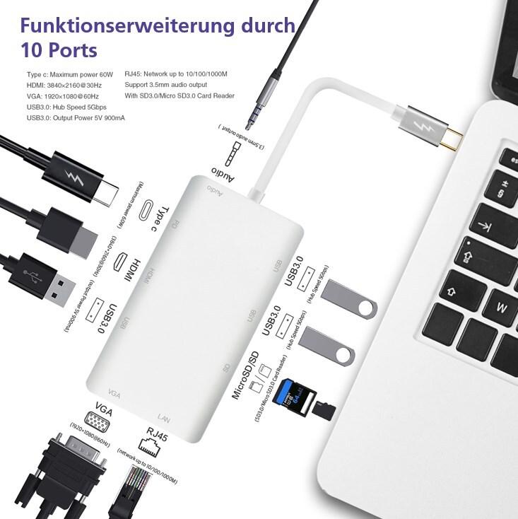 | Schnittstellen | 1 x Netzwerk - 1000Base-T - RJ-45 3 x SuperSpeed USB 3.0 - 9-poliger USB Typ A 1 x Display / Video - HDMI - 19-poliger HDMI Typ A 1 x USB-C mit Stromversorgung (60 W) - 24-poliger USB-C 1 x Audio - line-Out - Mini-Phone Stereo 3,5 mm |
