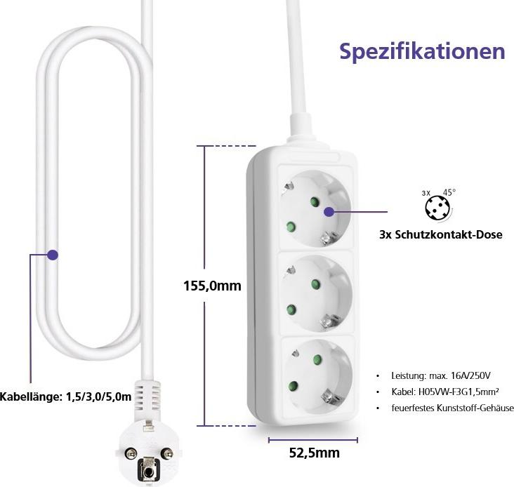 Helos Steckdosenleiste CLASSIC, 3-fach, weiß, 3,0m, ohne Schalter Robustes klassisches Design , 3,0m Zuleitung , Leiterquerschnitt: 1,5 mm² , Kabeltyp: H05VV-F 3G1.5mm , ohne Schalter , 3 Schutzkontaktsteckdosen 45° gedreht , mit ...