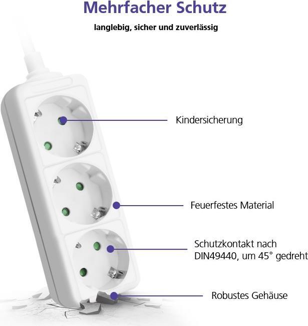 Helos Steckdosenleiste CLASSIC, 3-fach, weiß, 3,0m, ohne Schalter Robustes klassisches Design , 3,0m Zuleitung , Leiterquerschnitt: 1,5 mm² , Kabeltyp: H05VV-F 3G1.5mm , ohne Schalter , 3 Schutzkontaktsteckdosen 45° gedreht , mit Berührungsschutz , belastbar bis zu 16 A/230V (4000 Watt) , VDE, CE und GS-Zertifiziert , Farbe: weiß (262788)