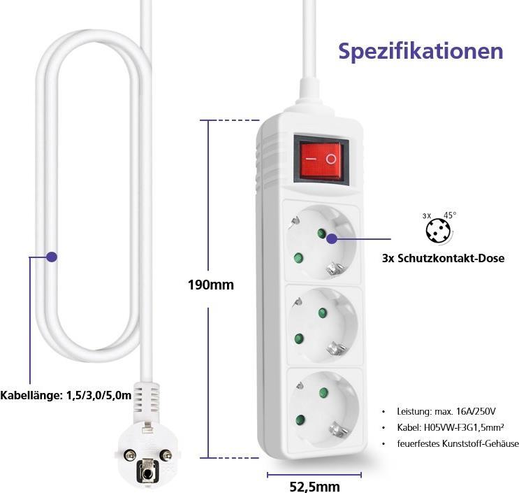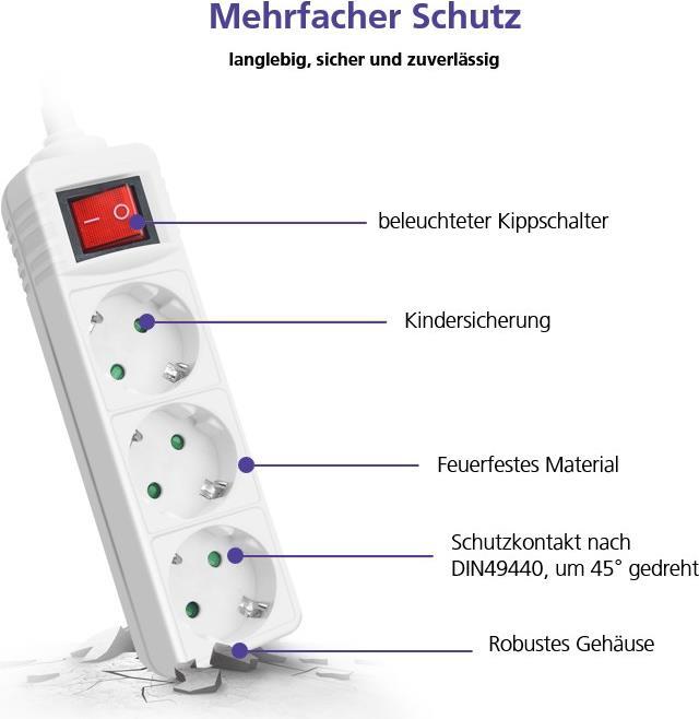 Helos Steckdosenleiste CLASSIC, 3-fach, weiß, 5,0m, mit Schalter Robustes klassisches Design , 5,0m Zuleitung , Leiterquerschnitt: 1,5 mm² , Kabeltyp: H05VV-F 3G1.5mm , mit Schalter , 3 Schutzkontaktsteckdosen 45° gedreht , mit Berührungsschutz ...
