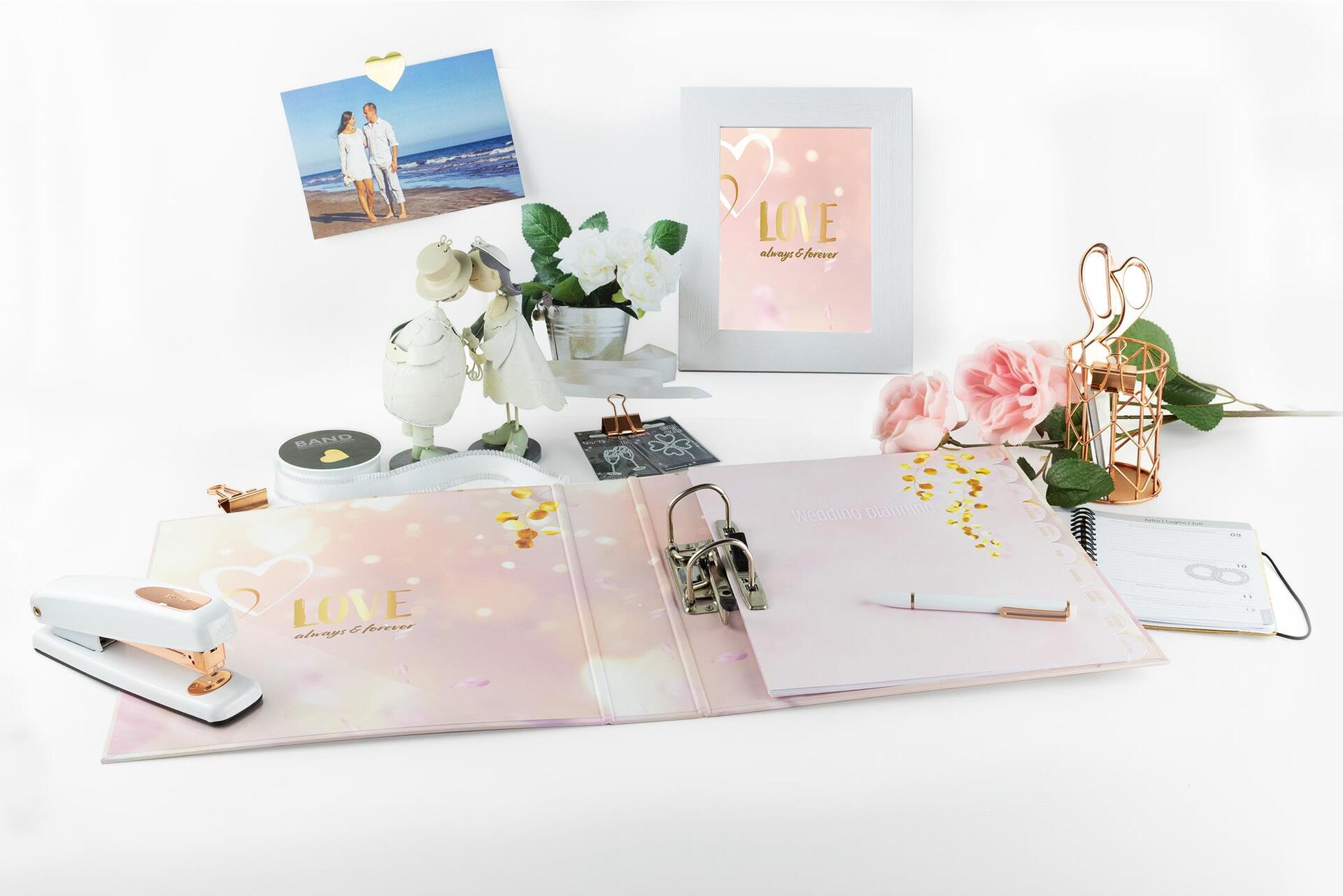 Bald läuten die Hochzeitsglocken und der schönste Tag im Leben zweier Liebenden rückt näher und näher. Doch bevor der Traum einer perfekten Hochzeit wahr wird, müssen Sie im Vorfeld Ihr Organisationstalent unter Beweis stellen. Der Hochzeitsordner von HERMA hilft Ihnen dabei. Viele Dinge müssen geplant und organisiert werden: Wo findet die Trauung statt? Wer wird eingeladen? Wie sieht die Tischdekoration aus? Dieser hübsche und modern gestaltete Ordner hilft Ihnen bei der Archivierung aller wichtigen Hochzeitsunterlagen und sorgt dafür, dass keine Dokumente, Listen oder Notizen verloren gehen. Im handlichen DIN A4 Format lässt er sich einfach überall hin transportieren, sodass Sie alle notwendigen Papiere immer dabei haben. Die hochwertige Hebelmechanik und der Niederhalter aus Metall halten den Ordnerinhalt eng beisammen, sodass dieser nicht verdreckt wird oder herausfallen kann. Das illustrierte und übersichtliche Register hilft Ihnen bei der Planung und berücksichtigt alle Punkte, die für eine Hochzeit wichtig sind, wie z.B. die Organisation der Tischdeko, des Caterings, der Gästeliste uvm. Ihre Termine sind sofort, immer und überall griffbereit. Das schlichte, aber elegante Design mit rosanem Hintergrund und dem ""LOVE for ever"" - Spruch werden für Hingucker sorgen - rt! Mit dem 60 mm breiten Ordnerrücken und dem 300 x 315 Format ist für ausreichend Platz gesorgt.