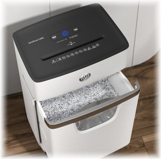 HP OneShred 10MC Aktenvernichter mit Partikelschnitt P-5, 2 x 15 mm, bis 10 Blatt, weiß (2804)
