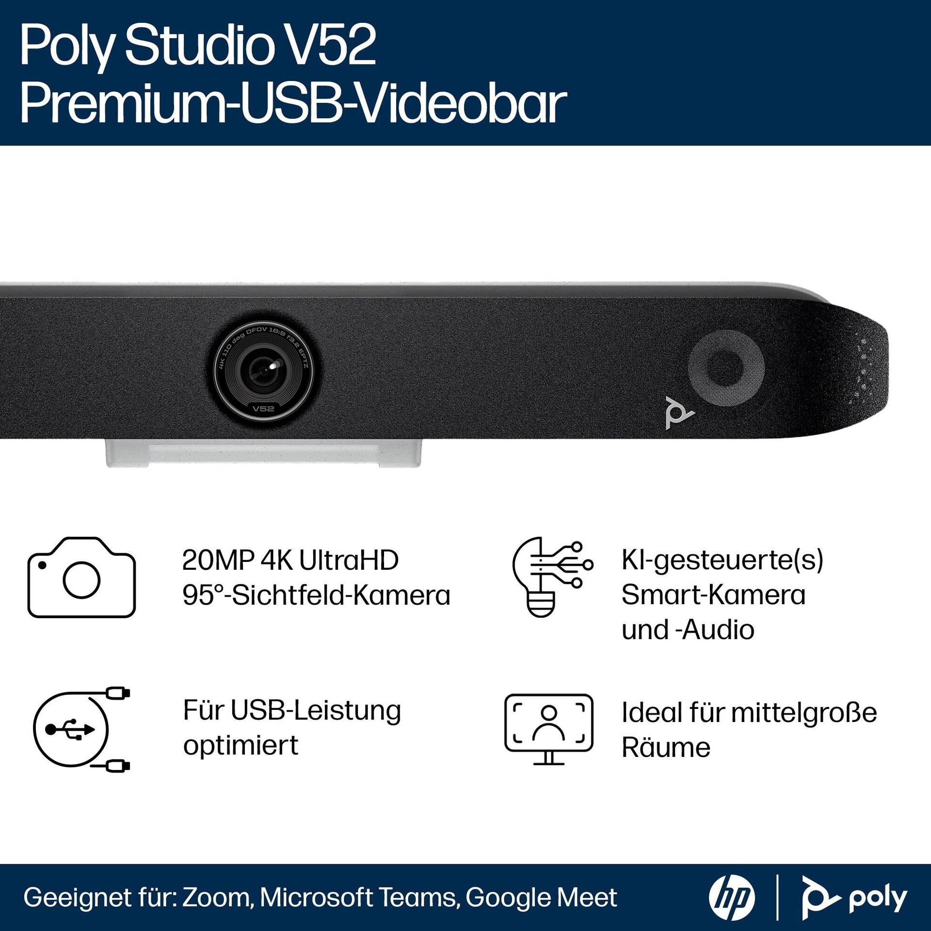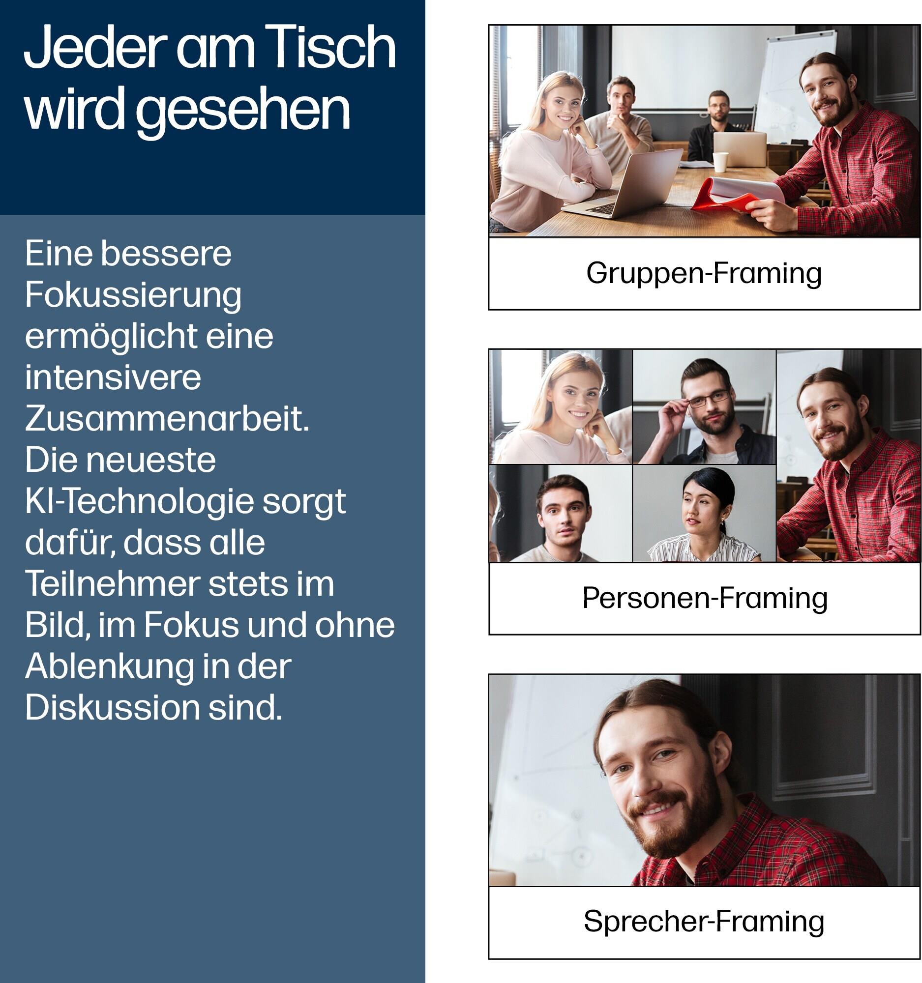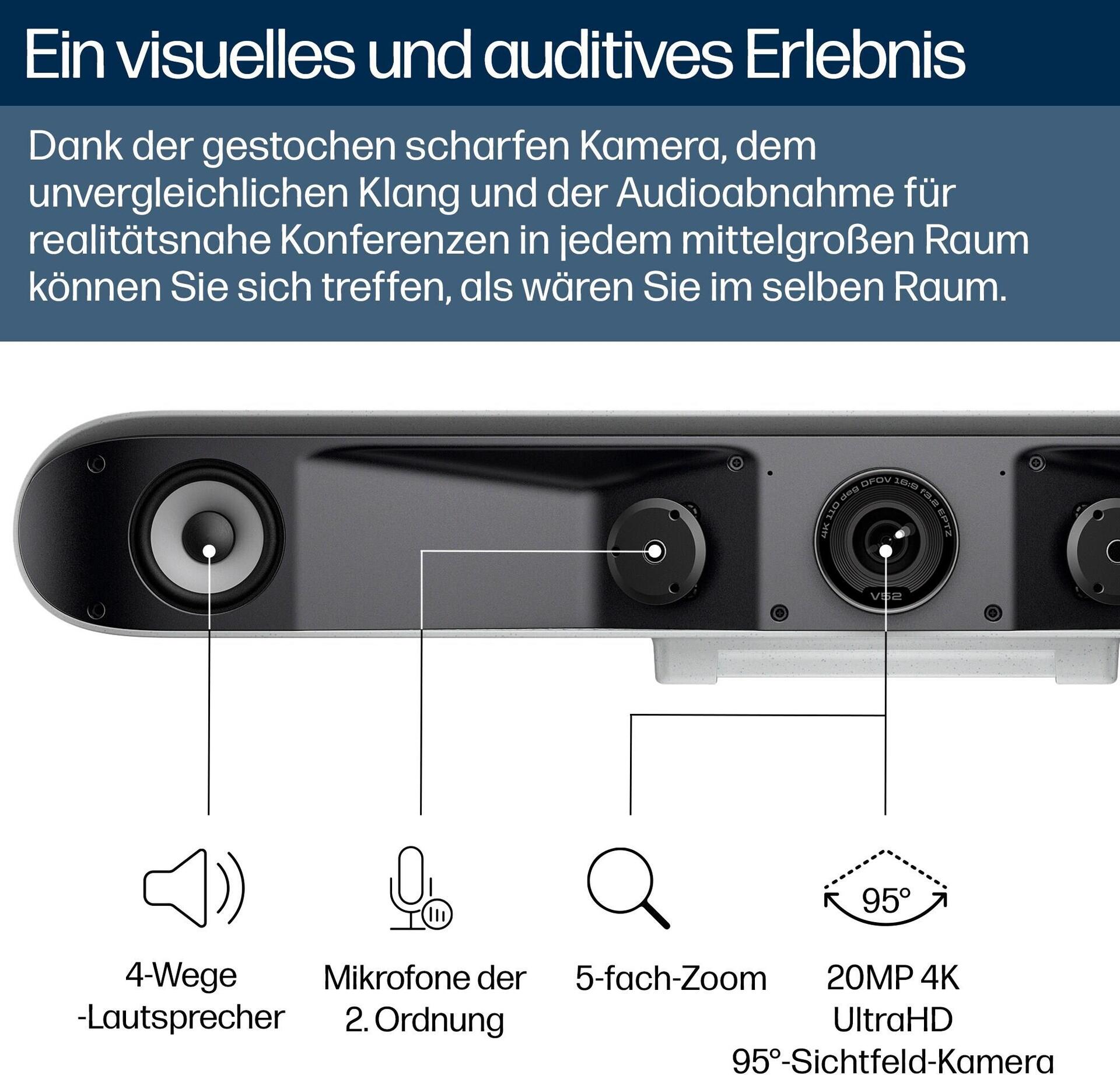 110° diagonaler Bildwinkel, 95° Sichtfeld (horizontal), automatisches Framing von Personen, Group framing, Presenter-Tracking, Poly DirectorAI-Technologie, Security Slot (Kensington-Sicherheitsschloss kompatibel), 6.1 m microphone pick up range, Poly Acoustic Fence-Technologie, Poly NoiseBlockAI-Technologie |