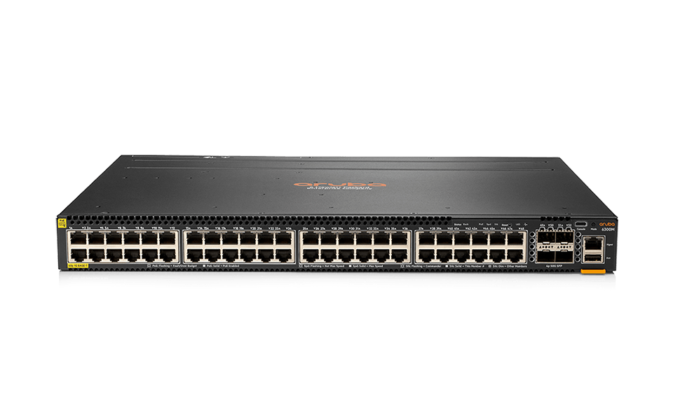 Die HPE Aruba Networking CX 6300 Switch-Serie ist eine moderne, flexible und intelligente Reihe modularer (stapelbarer) AOS-CX Switches, die sich ideal für den Zugriff, die Aggregation und die TOR-Rechenzentrums-Bereitstellung (Top-of-Rack) eignen. Mit seinem Cloud-orientierten Design, das ein voll programmierbares Betriebssystem mit der HPE Aruba Networking Analytics Engine kombiniert, erweitert der CX 6300 die branchenführenden Überwachungs- und Fehlerbehebungsfunktionen auf die Zugriffsebene. Die Unterstützung von HPE Aruba Networking und der HPE CX Mobile App stellt sicher, dass die Konfigurationen fehlerfrei und einfach bereitzustellen sind. Eine leistungsstarke Architektur von HPE Aruba Gen7 ASIC bietet eine schnelle, blockierungsfreie Leistung, damit Ihr Netzwerk für die unvorhersehbaren Anforderungen von morgen gerüstet ist. Das HPE Virtual Stacking Framework (VSF) ermöglicht das Stacking von bis zu 10 Switches und lässt sich so erweitern und einfacher verwalten. Diese flexible Serie verfügt über integrierte Hochgeschwindigkeits-Uplinks und unterstützt IEEE 802.3bt PoE mit hoher Dichte mit HPE Smart Rate Multi-Gigabit-Ethernet für Hochgeschwindigkeits-APs und IoT-Geräte.
